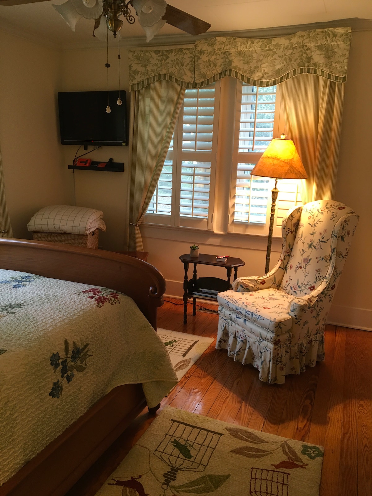 Two-room suite and private bath in one wing of 1925 Bungalow located at the entrance to Aiken’s Historic Horse District. Enjoy your private bedroom sleeping in an early 20th Century double bed, retro private bath with shower/tub, 2nd bedroom is a sunny sitting room with desk, comfy chair & ottoman, day bed with cozy pillows and an amenities station: Keurig coffee maker, filtered water dispenser, small refrigerator. Laundry room on-premises. Front porch rockers capture the Aiken experience.