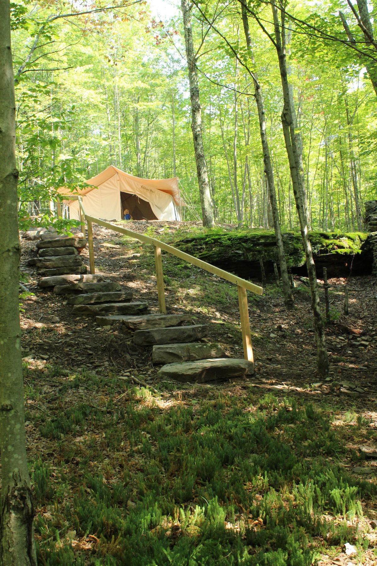We are offering a beautiful, COMFORTABLE, option to camping. Our off grid tent comes with all the comforts of home including a wood stove and reading nook! It is nestled into a hemlock grove overlooking the active beaver pond. Walking trails and local activities at a stones throw. If you have a small boat or kayaks- BRING them! We have space in the yard and lots of local places to send you to get good use out of them. Please do not use on our pond. We have a boat available for use.