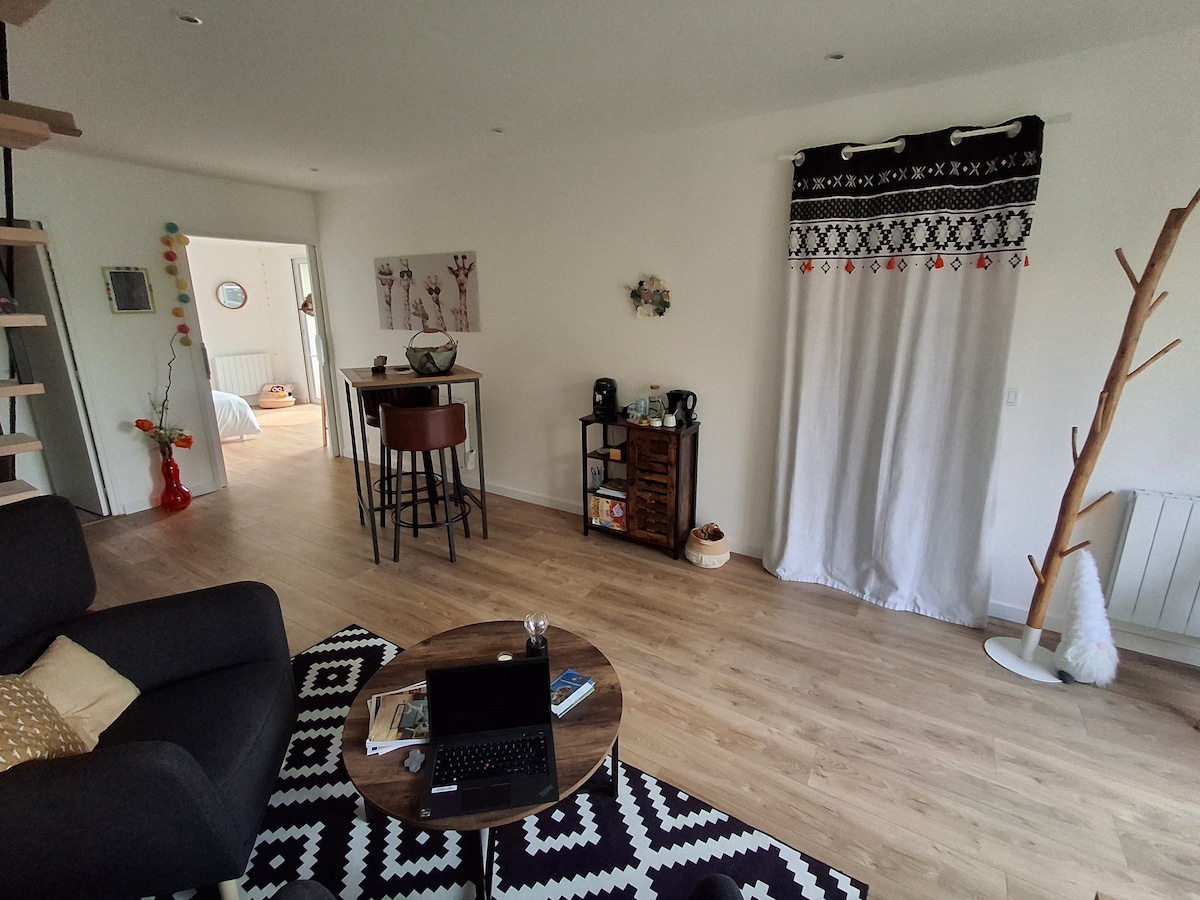 Πολύ ωραίο κατάλυμα σε ήσυχη γειτονιά που περιλαμβάνει: - 1 υπνοδωμάτιο με δύο διπλά κρεβάτια (1 εκ των οποίων σε ημιώροφο), - Ένα μπάνιο εξοπλισμένο με πλυντήριο ρούχων, πιστολάκι μαλλιών, στεγνωτήριο πετσετών, ντους, σίδερο, φωτιζόμενο καθρέφτη, - Εξοπλισμένη κουζίνα που ανοίγει στο σαλόνι με καναπέ-κρεβάτι 2 θέσεων, - Τηλεόραση με διεθνή κανάλια, - Μια εξωτερική βεράντα. Θα νιώσετε άνετα και σαν στο σπίτι σας. Παρέχονται κλινοσκεπάσματα και πετσέτες μπάνιου.