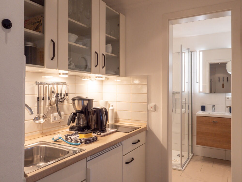 Schöne Ferienwohnung (50 m², Souterrain) für bis zu 3 Personen mit Südterrasse und Gartenanteil mit Strandkorb und Gartenmöbeln, in Dünennähe, ca. 300 m zum Strand, Bad mit WC und großer Glasdusche, Fußbodenheizung und Föhn,Wohnraum mit Schlafsofa (Liegefläche 135 x 225 cm), Kabel-TV, DAB-Radio mit CD-Spieler, USB und Bluetooth, WLAN, Komplett ausgestattete Einbauküche mit Spülmaschine, Nespresso- und Filterkaffeemaschine, Toaster und Wasserkocher. Babybett, Hochstuhl auf Anfrage