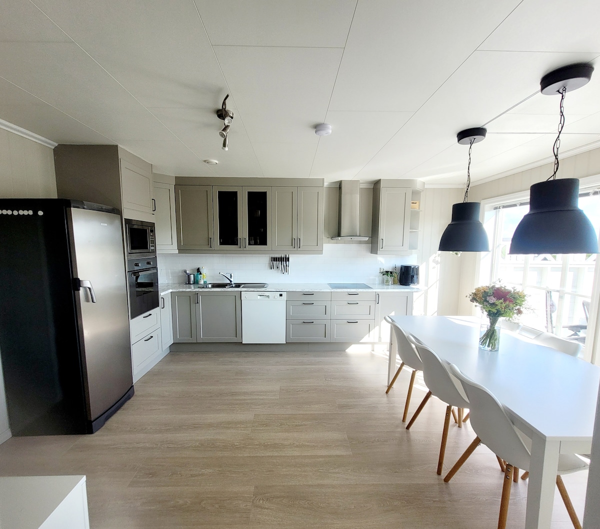 A Nordic cabin built in 2017. Large terrace with outdoor furniture and an campfire pan for cosy nights. Parking space for at least 3 cars outside. Lovely modern, but worm interior with Scandinavian design. 3 bedrooms and 2 bathrooms. Big windows in the living room, and on the frontal wall of the master bedroom. This makes for a breath-taking and romantic view. A good size bathroom and walk-in /nursery is attached to the master bedroom on the top floor. This floor is well suited for couples.
