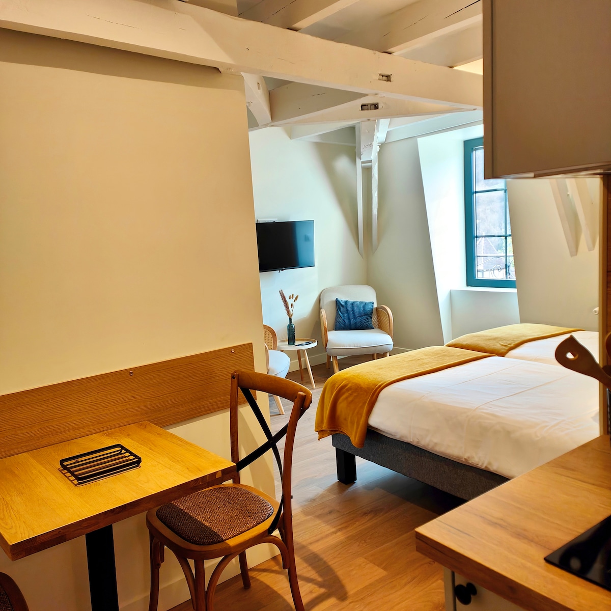 Ολοκαίνουργιο, άνετο και κομψό στούντιο διαμερισμάτων με όλες τις ανέσεις και τις παροχές μιας υπηρεσίας ξενοδοχείου (σεντόνια, πετσέτες, καθαρισμός, έξυπνη τηλεόραση, άνετα κλινοσκεπάσματα, Wi-Fi) με εξοπλισμένη κουζίνα (πλυντήριο πιάτων, επαγωγική εστία, φούρνο μικροκυμάτων, καφετιέρα Senséo, μαγειρικά σκεύη...) που σας επιτρέπει να διαχειρίζεστε τη διαμονή σας ανεξάρτητα, σαν στο σπίτι σας! Με εκπληκτική θέα στο χωριό και τους γκρεμούς του.