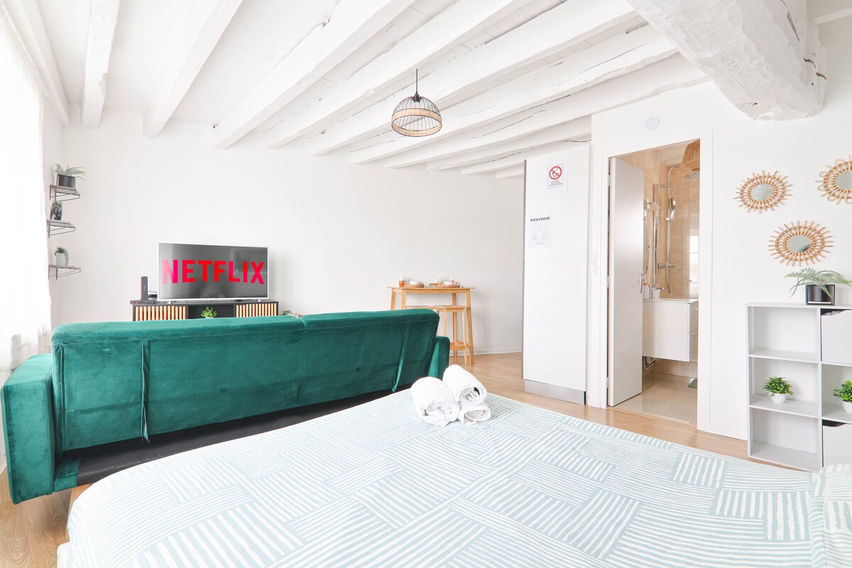 Γοητευτικό πλήρως ανακαινισμένο σπίτι 30 τ.μ. με τον ευχάριστο μικρό ιδιωτικό κήπο του, ήσυχο από τον δρόμο, φωλιασμένο στον μεγάλο κήπο ενός όμορφου και παλιού καταπράσινου συγκροτήματος στο κέντρο της πόλης Etampes, εγγυημένη αγάπη με την πρώτη ματιά: μεγάλο σαλόνι με νέα και άψογα εξοπλισμένη ανοιχτή κουζίνα! Εκτεθειμένες πέτρες & δοκοί, εξοπλισμός και περιβάλλον υψηλής ποιότητας, όλες οι ανέσεις με νέο και πτυσσόμενο κρεβάτι queen-size: το σαλόνι μετατρέπεται σε μεγάλο υπνοδωμάτιο!