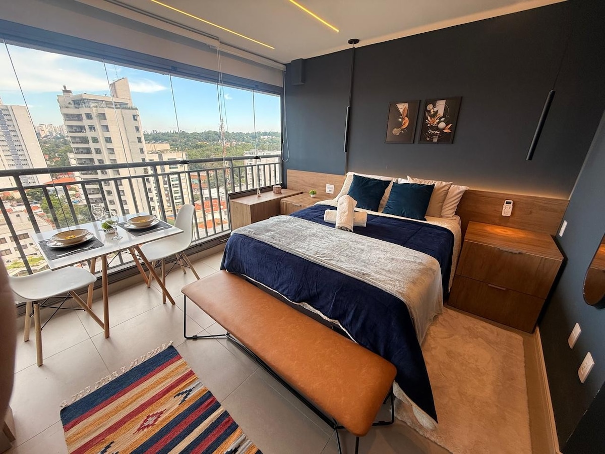 Relaxe neste studio moderno, decorado por arquiteto e com vista livre para São Paulo. O condomínio oferece piscina, academia, mini mercado e lavanderia — ideal para trabalho ou lazer. A localização é imbatível: A 7 min a pé do metrô Borba Gato e a poucos passos de mercado, farmácia, cafés e restaurantes. Pontos de interesse próximos: • Consulado dos EUA – 4 min* • Transamérica Expo Center – 10 min* • Aeroporto de Congonhas – 10 min* • Shopping Morumbi e Market Place – 12 min* *De carro