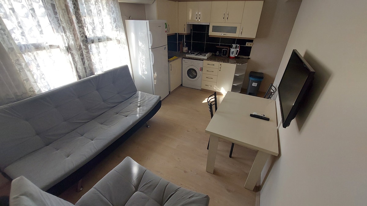 1+1 διαμέρισμα διαθέτει ένα διπλό κρεβάτι και 1 καναπέ-κρεβάτι στο σαλόνι μπορεί να φιλοξενήσει 3 άτομα. Το διαμέρισμα διαθέτει κουζίνα και σκεύη κουζίνας, κρεμάστρα πλυντηρίου, βραστήρα ντουλάπας, πιστολάκι μαλλιών και υπάρχει πλυντήριο ρούχων στον κοινόχρηστο χώρο. Υπάρχει δωρεάν χώρος στάθμευσης μπροστά στο κτίριο. Το κτίριο με θέα στην παραλία είναι προσβάσιμο σε 5 λεπτά με τα πόδια από το κέντρο της πόλης και τη μαρίνα. Το διαμέρισμα, το οποίο διαθέτει καφετέρια, μπαρ, εστιατόριο, φαρμακείο, ιδιωτικό νοσοκομείο και παντοπωλείο γύρω του, βρίσκεται σε ένα φωτεινό και ήσυχο μέρος.