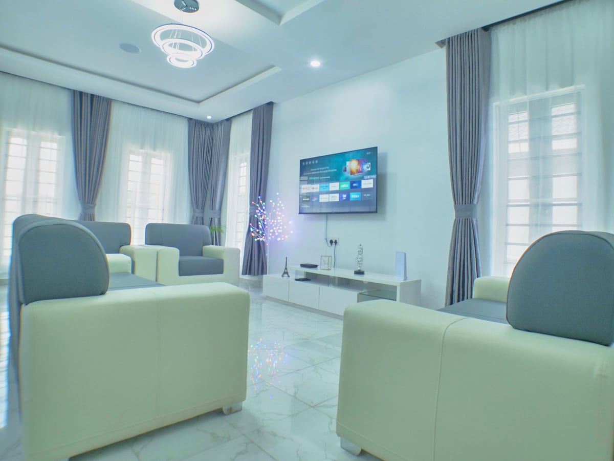 Τιμή για μακροχρόνια διαμονή, ίντερνετ με WiFi, τρία (3) κλιματιστικά, ζεστό νερό, ηλιακό σύστημα inverter, ασφαλές, μεγάλα κρεβάτια, ιδιωτική πίσω αυλή, ιδιωτικό πάρκινγκ, ευρύχωρη κουζίνα, παιδική χαρά, έξυπνη τηλεόραση, κοντά σε δέντρα/δάσος για να απολαμβάνετε τον καθαρό αέρα και πολλά άλλα. Χαλαρώστε με όλη την οικογένεια σε αυτόν τον ήσυχο χώρο. Κατάλληλος χώρος εργασίας/γραφείο. Κατά την άφιξη παρέχονται μονάδες ηλεκτρικής ενέργειας αξίας 10.000 NGN, μετά τις οποίες ο επισκέπτης θα είναι υπεύθυνος για το κόστος της ηλεκτρικής ενέργειας.