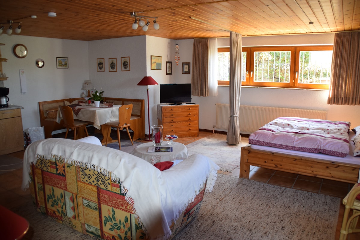 The apartment is on the ground floor of an old farmhouse, newly renovated and modernly equipped. Excellently located, between the Black Forest, Lake Constance and Alb. Ideal for 2 people. Living-bedroom with sitting area and double bed, blackout blinds. Fully equipped kitchen: Senseo coffee machine... Daylight bathroom with rainforest shower. The apartment is self-contained, we live upstairs and use the same entrance. The apartment is pet-free, but our cat lives in the house and garden.