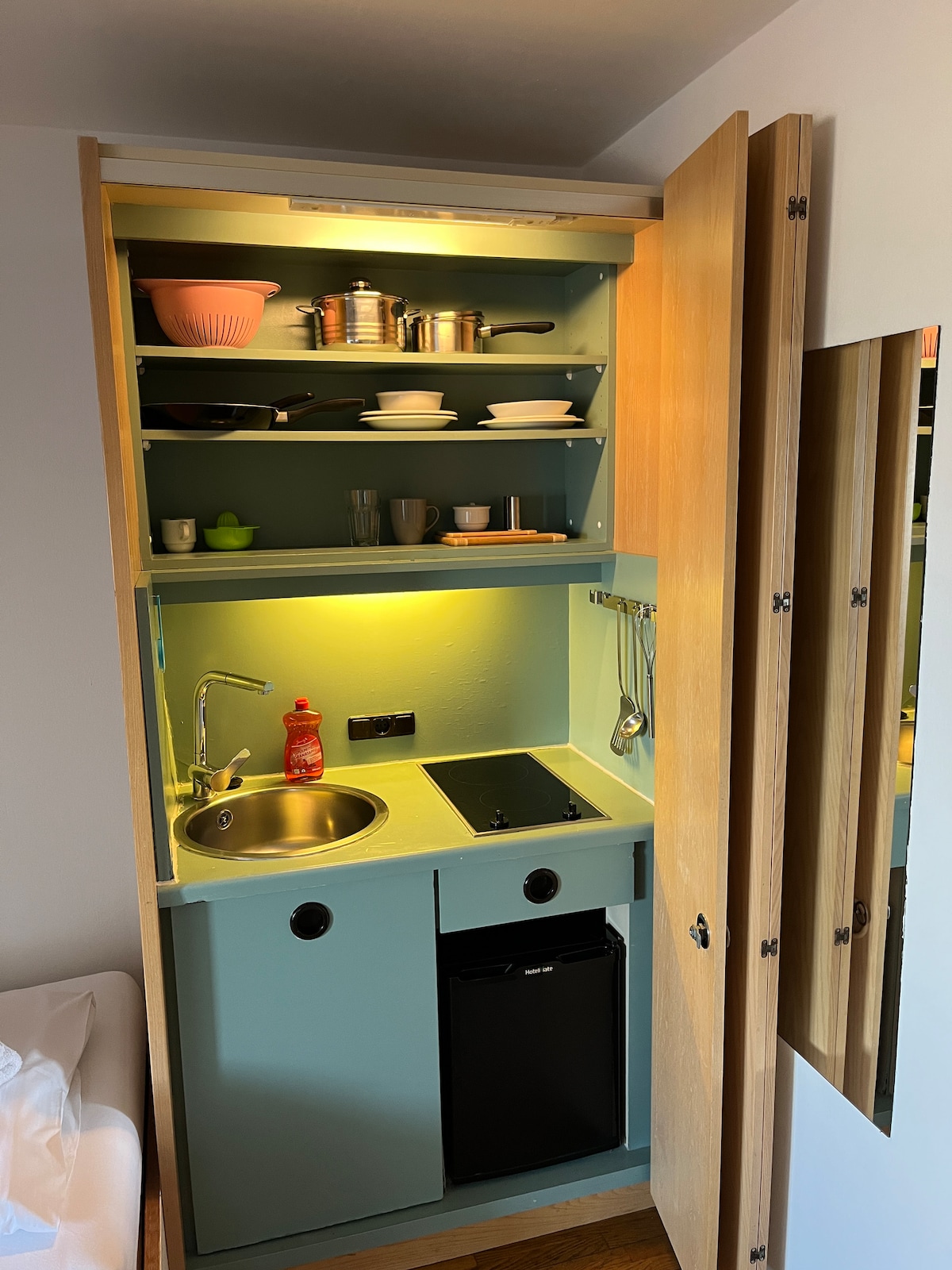 The apartment IRIS is located in a traffic calmed area in the center of Oberammergau between City hall and the Museum. Many shops including grocery stores, tourism information, train station and the Passionplay theatre can be reached comfortably by foot. The apartment is about 650 sqft in size with a living room with kitchen, 1 bed room, bathroom with shower, a private outside sitting area, parking space. The garden with a grill, a washing machine and drier are shared with other house guests.