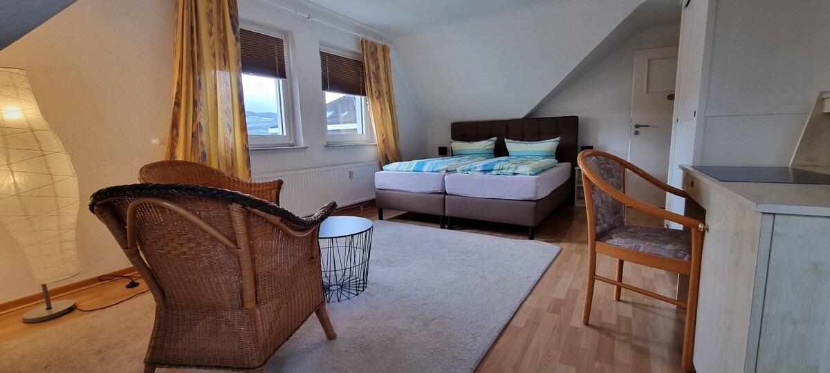 Weserbergland μεταξύ Einbeck και Bodenwerder. Αυτό το φωτεινό, ευρύχωρο διαμέρισμα επιπλώθηκε πρόσφατα το 2019/20 και βρίσκεται στο Amtshaus Wickensen, ένα σύνολο της Αναγέννησης του Weser από το 1542. Το διαμέρισμα διαθέτει κουζίνα, σαλόνι και υπνοδωμάτιο με ιδιωτικό μπάνιο. Κατάλληλο για 1 έως 4 άτομα.