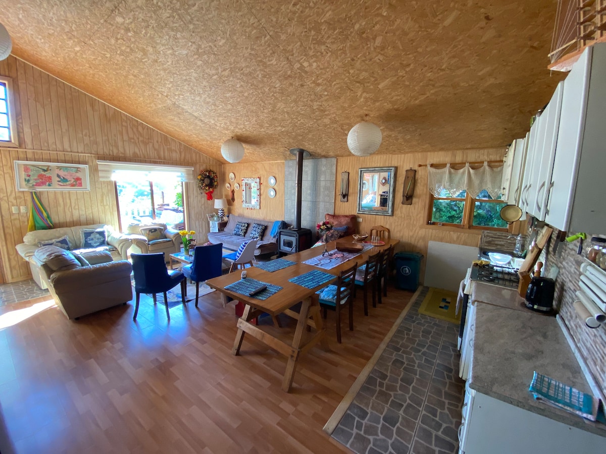 Απολαύστε μια ξεκούραση που σας αξίζει με την οικογένειά σας σε ένα ξυλόσπιτο που περιβάλλεται από τη φύση, τα δέντρα, την άγρια ζωή και τα θαύματα του Ειρηνικού Ωκεανού. Εκτός από χαλαρωτικά μπάνια σε μπανιέρες με ζεστό νερό. (βάζο με επιπλέον κόστος κατόπιν συμφωνίας με τον οικοδεσπότη).
