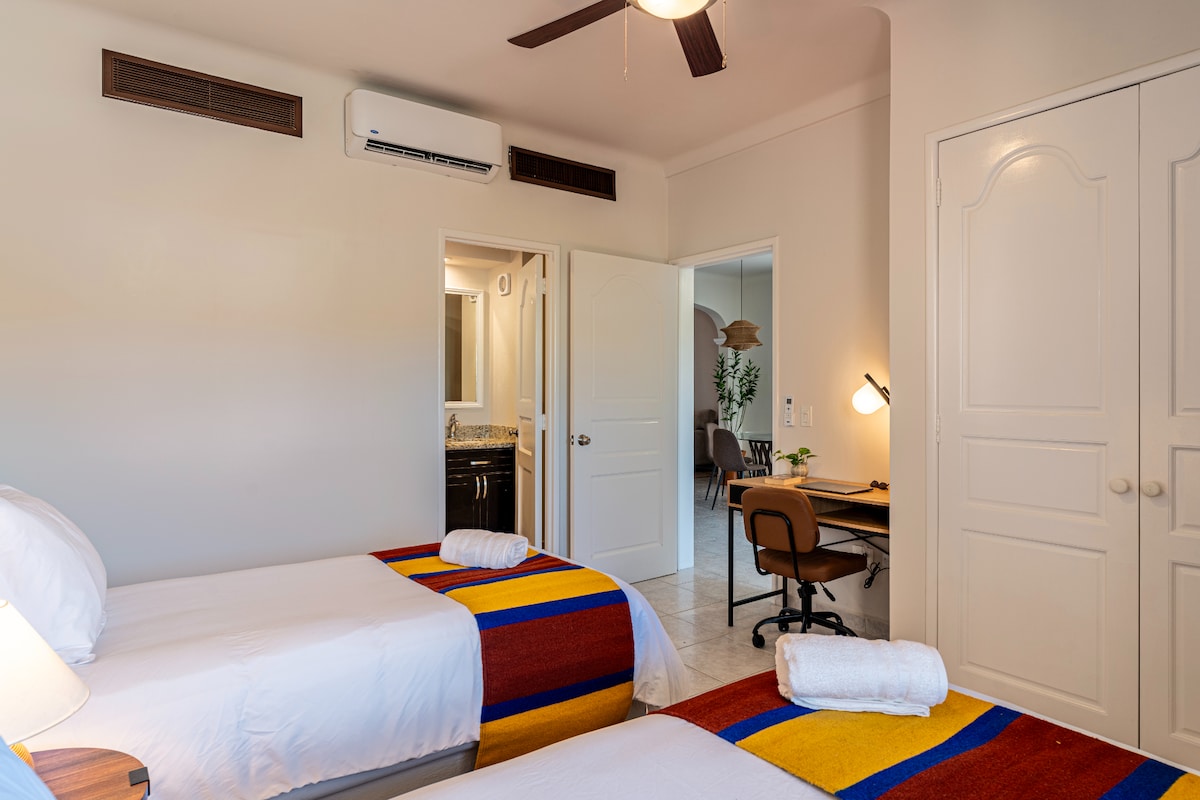 Comfortable 2-bedroom apartment featuring 1 double bed, 2 twin size beds, two bathrooms, a full kitchen, and a comfortable living area. Enjoy A/C, fast WiFi, and access to the shared pool. Just minutes from Costa Azul Beach and the surf breaks of San José del Cabo.