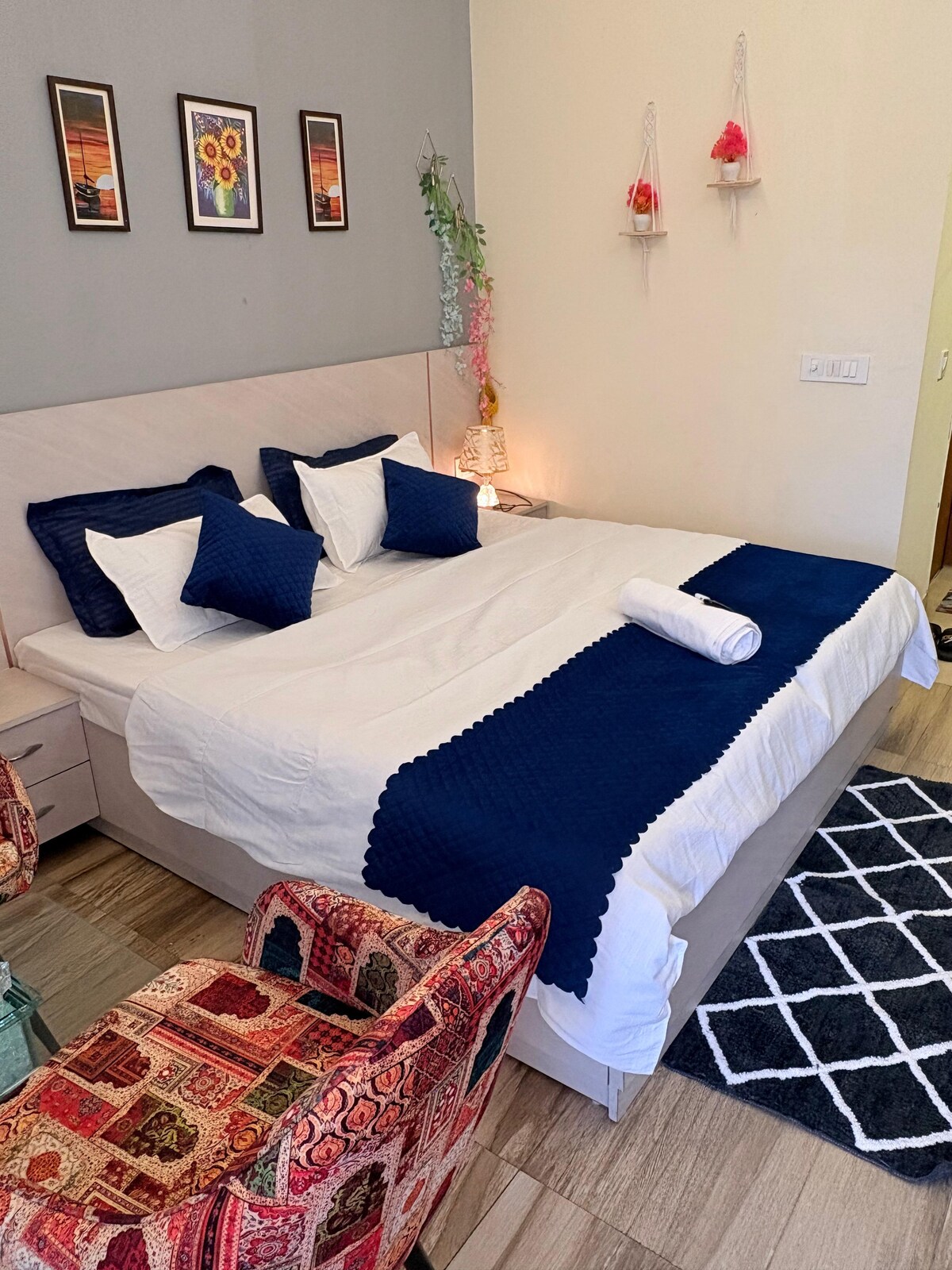 Ένα μέρος που κρατάει το δικό του στη μέση του συνωστισμένου πλήθους. Ιδανικό μέρος για μουσικούς εν κινήσει, ταξιδιώτες με στυλ ή απλά για κάποιον που αναζητά μια οικονομική αλλά μοναδική σύντομη διαμονή στην πόλη. Το 3 BHK διαθέτει ένα αποκλειστικό στούντιο για να καλύψει όλες τις ανάγκες των δημιουργών περιεχομένου της νέας εποχής, έναν χώρο γραφείου, 1 κύριο κρεβάτι, 1 επεκτάσιμο κρεβάτι και έναν καναπέ-κρεβάτι σε σχήμα Γ και μια κουζίνα. Όλα τα δωμάτια είναι κλιματιζόμενα με έξυπνο φωτισμό. Σαλόνι εξοπλισμένο με τηλεόραση 55 ιντσών, 7.2 AV και οθόνη προβολής 10 ft.