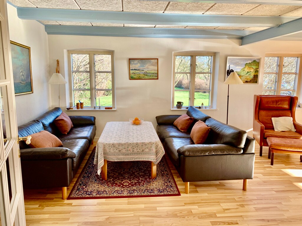 Huset ligger i Mårup på Nordøen, tæt på havnen og Nordby bakker. Der er 900m i luftlinje mellem begge strandsider. Huset er rummeligt, højt til loftet og med mange hyggekroge. Den skønne bakkede natur er kendetegnet for Nordøen, den starter lige ude foran døren. Nordøen har indkøb, restauranter og specialbutikker. Vi har specialbutikken HØST og en Vin & Kaffebar. Galleriet er med Pernilles værker og Jakobs værker findes i Caféen. Inkluderet sengelinned, håndklæde og badehåndklæde pr. person