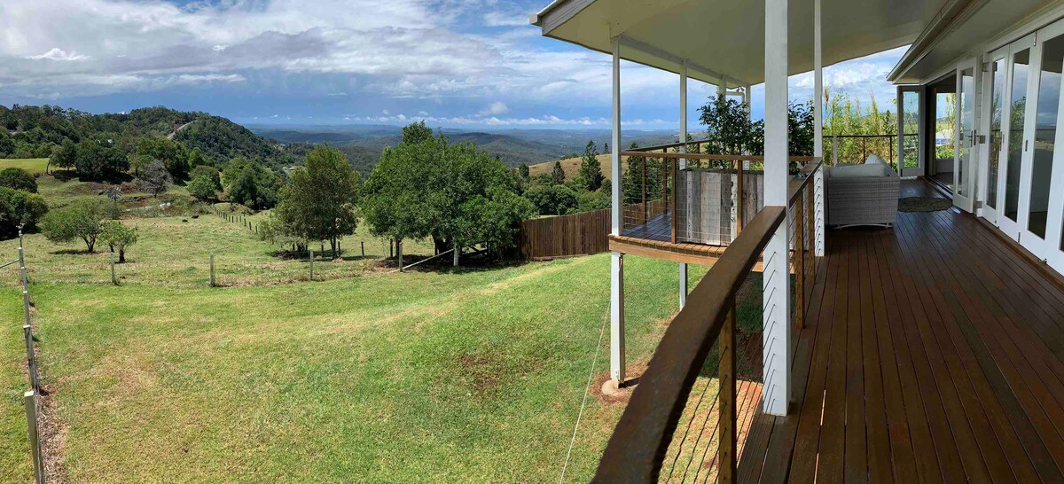 Ξυπνήστε με την ανατολή του ηλίου πάνω από την κοιλάδα Mooloolah και δείτε τους αετούς να πετούν κατά μήκος της οροσειράς Blackall. Αυτό το εξοχικό σε στιλ αρχοντικού προσφέρει εκπληκτική θέα στην κοιλάδα και στον ωκεανό, με τον δικό σας ιδιωτικό κήπο και τζάκι εξωτερικού χώρου. Σε ιδανική τοποθεσία, μόλις 5 λεπτά από το Maleny και το Montville, βρίσκεστε στο κέντρο των αξιοθέατων της ενδοχώρας, αλλά σε μια ήσυχη κορυφογραμμή που μοιάζει απομακρυσμένη από όλα. Ο ζωολογικός κήπος της Αυστραλίας απέχει 18 λεπτά, οι παραλίες Caloundra 35 λεπτά. Απολαύστε την ιδανική βάση για να χαλαρώσετε και να εξερευνήσετε την ενδοχώρα.
