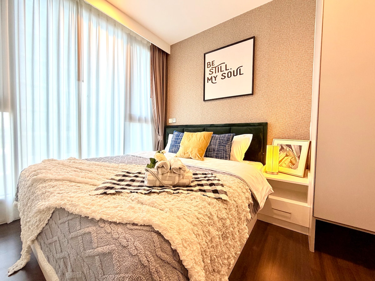 Ένα νέο άνετο δωμάτιο για 2 άτομα με πλήρεις εγκαταστάσεις και απέχει μόλις ένα λεπτό από το εμπορικό πολυκατάστημα και παίρνει μόνο 3 στάσεις λεωφορείων για το Συνεδριακό Κέντρο BITEC. Το διαμέρισμα είναι απέναντι από το εμπορικό κέντρο τροφίμων και είναι εύκολο να πάρετε ταξί για το αεροδρόμιο.