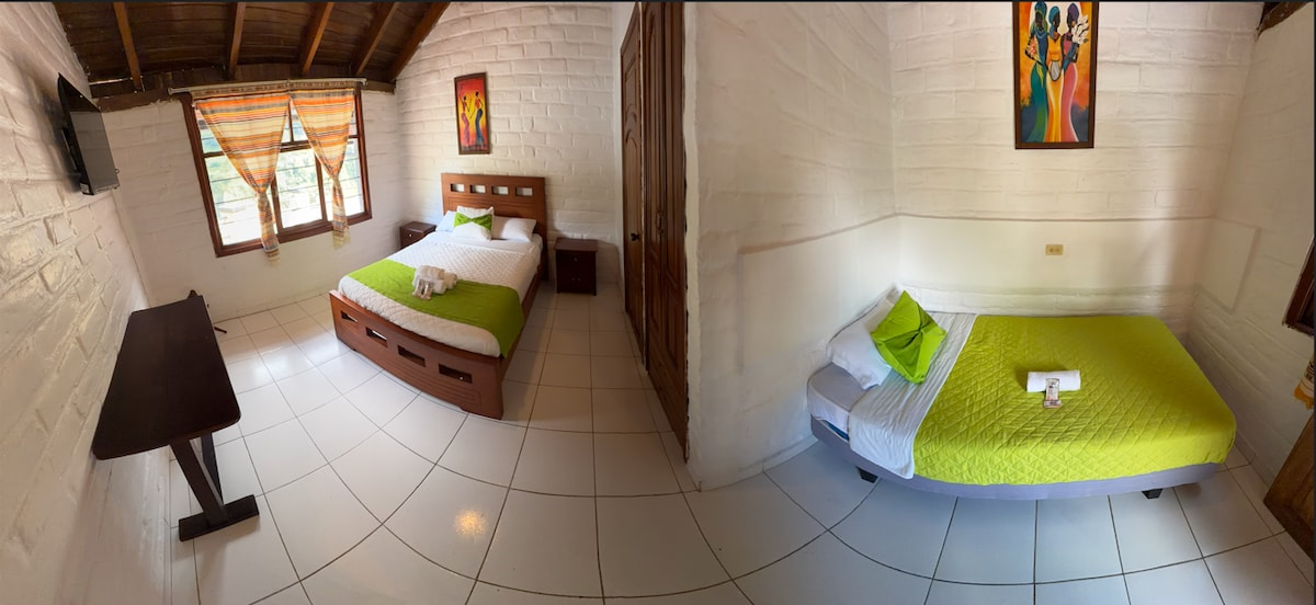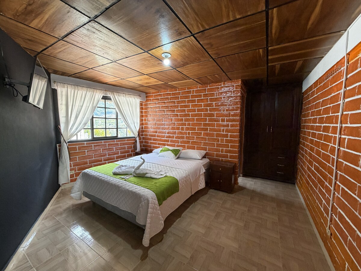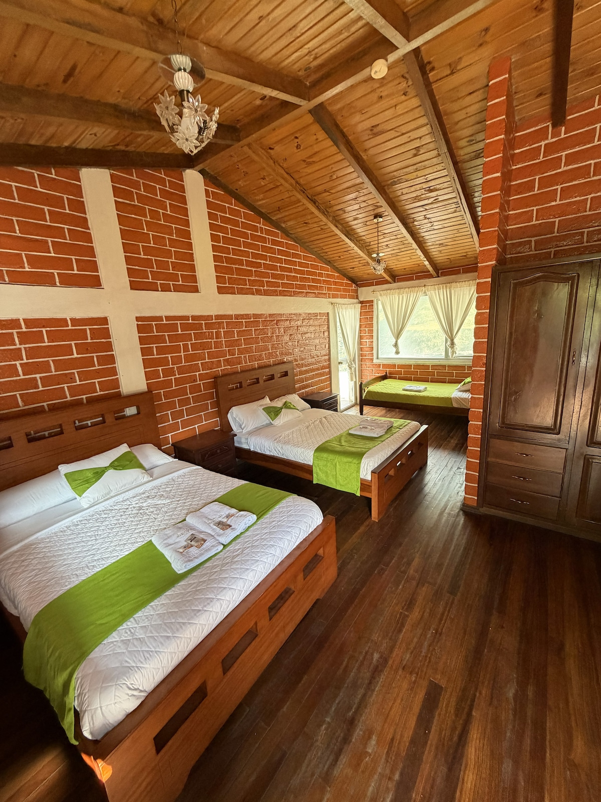 Inviting double room ideal for travelers who want comfort without overspending. Bathroom is shared and kept exceptionally clean. Guests enjoy access to wide-open grounds, rustic design, relaxing common spaces, and convenient parking. Close to Baños’ most popular destinations while offering a peaceful retreat surrounded by nature.