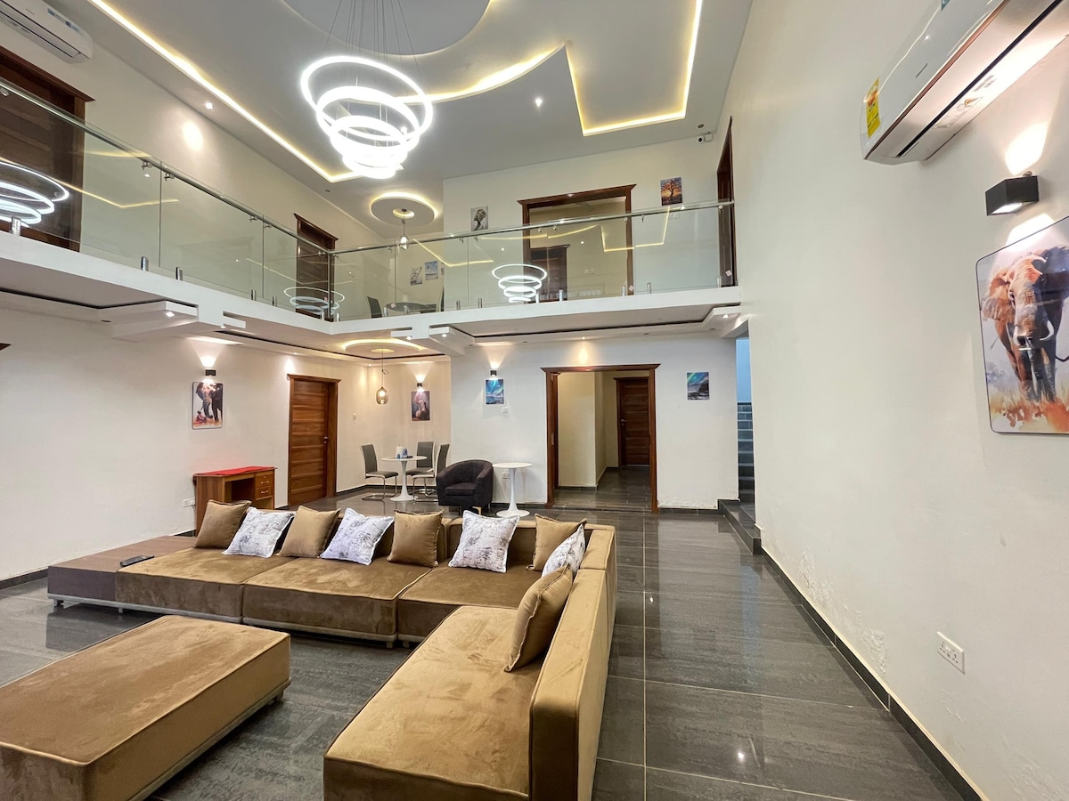 - Entire house to yourselves - Your own Private Cinema - 3 Bedrooms with Super King Size beds - 2 different Living Areas with a dining - Fully Equipped Kitchen - Washing Machine for your laundry - 24/7 CCTV Monitoring - 24/7 personal helper/assistant - Free secured car park - Each bedroom has its own balcony - Airconditioning Rooms - Free WiFi - Bed linen and towels Prempeh Int’l Airport is 9 miles from the villa. Escape from the noise in the city and come to this peaceful haven.
