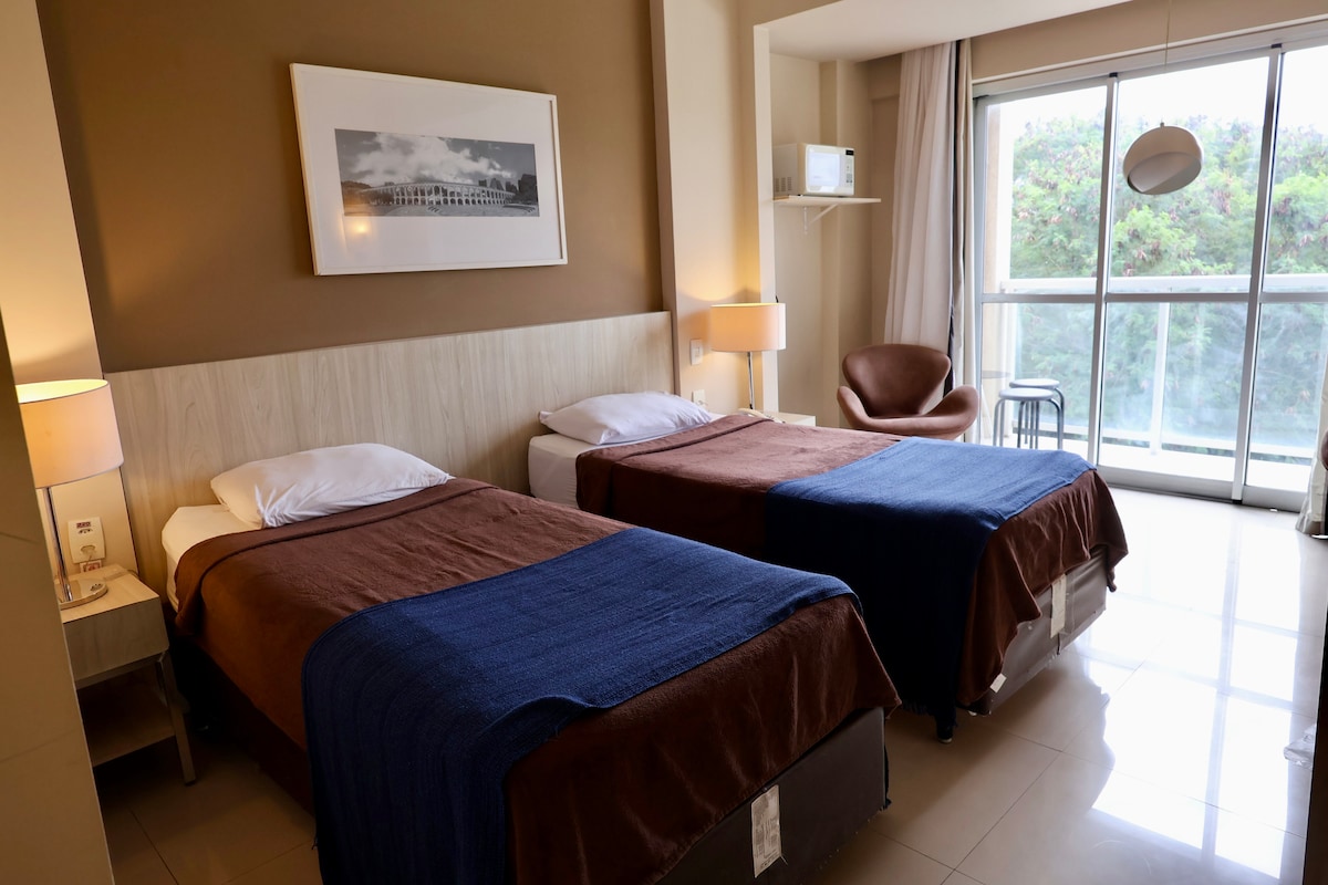 Υπέροχο μέρος με πολύ πράσινο, μπαλκόνι με θέα, αιώρα και πρωινό ήλιο, ενσωματωμένο σαλόνι (καναπές-κρεβάτι, τηλεόραση, κλιματιστικό), υπνοδωμάτιο με κρεβάτι queen size, ντουλάπα και χρηματοκιβώτιο. Θερμαινόμενη πισίνα, εστιατόριο και πάρκινγκ στο κτίριο. Ιδανική 📍 τοποθεσία: ήσυχη περιοχή, κοντά σε αγορές, εμπορικά κέντρα και παραλίες της Barra. Εύκολη πρόσβαση με αυτοκίνητο, μετρό, BRT, Uber, θαλάσσιο ταξί ή ποδήλατο! Ανακαλύψτε γιατί ο Tim Maia αποθανάτισε τη φράση, 🎶 "Από το Leme μέχρι το Pontal, δεν υπάρχει τίποτα σαν αυτό!"