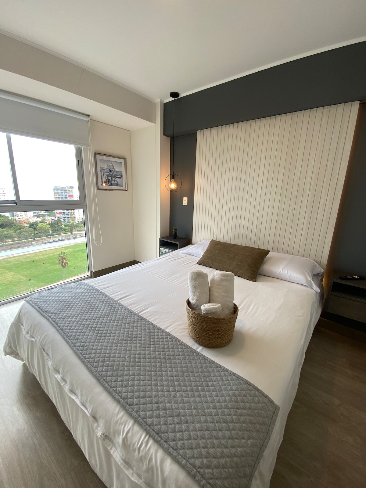 Departamento amplio y elegante en el corazón de Barranco: Ubicación privilegiada: A pasos de los principales puntos turísticos de Barranco y de los mejores restaurantes, bares y galerías de arte. Dormitorio principal: Cama king-size y gran walking closet. Espacio abierto y luminoso: Sala de estar y kitchenette con luz natural. Cochera privada: sujeta a disponibilidad Áreas comunes: Gimnasio, ambiente para reuniones y area de juego para niños. Estilo elegante: Decoración sofisticada.