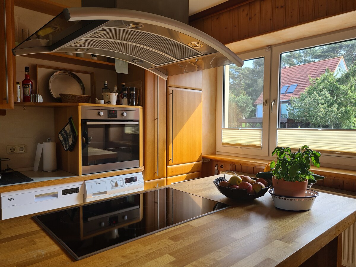 ... look out of your bed onto the water, enjoy the peace and quiet and listen to the rustle of the beech forest, experience bike tours directly on the water and enjoy nature. A beautiful, modern and rustic, low-energy half-timbered house with thatched roof, Moroccan tiles, oak floorboards and clay plaster walls awaits you. For activities there is a beautiful large garden with a forest swing, free steam sauna, outdoor shower and tub, a standup paddle, a paddle boat and 4 bicycles.