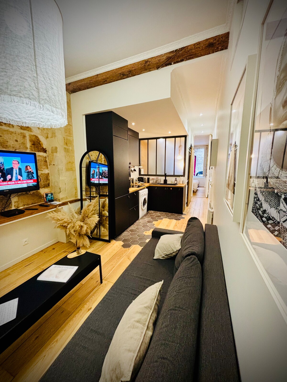 Magnifique appartement, cosy, équipé et très lumineux au cœur des chartrons Emplacement central parfait pour visiter. Parking, transports, commerces, restaurants et parc à proximité. Accès direct à la gare. Deux chambres (lit 160cm) avec salle d’eau privative et dressing sur mesure. Draps et serviettes fournis. Wc indépendant. Cuisine équipée , chauffage et climatisation dans toutes les pièces. Terrasse parfaitement exposée sans vis à vis avec coin repas. Wifi et TV 55' Parking proche