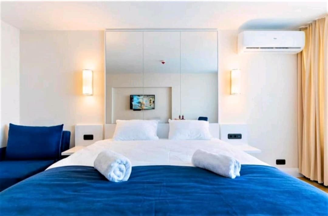 Πολυτελές διαμέρισμα στον 13ο όροφο του κτιρίου Courtyard by Marriott - Alliance Palace. Ένα υπνοδωμάτιο και ένα σαλόνι με μικρή κουζίνα. Ήρεμη και μινιμαλιστική διαρρύθμιση. Καλή ηχομόνωση. Ανακαίνιση υψηλής ποιότητας. Θέα στη θάλασσα στα αριστερά, την πόλη ακριβώς μπροστά και τα βουνά στα δεξιά!Διατίθεται κονσόλα Xbox με δύο τηλεχειριστήρια και καφετιέρα. Άφιξη χωρίς επαφή. Δωρεάν Wi-Fi! Το κτίριο διαθέτει ένα πολυτελές εστιατόριο με πρωινό σε μπουφέ. Η είσοδος κοστίζει 40 γέλ.