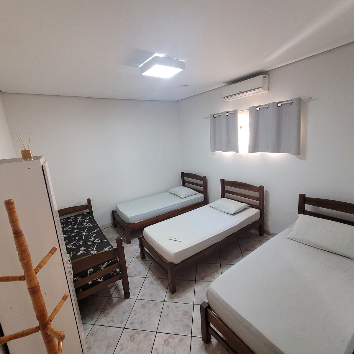 Casa com garagem para 2 carros ou 1 caminhonete de lado, privativa fechada e portão eletrônico, muros altos com cerca elétrica, muito seguro, quarto n° 1 com uma cama box de casal no quarto n°2 duas camas box de solteiro, guarda roupas, ventiladores de teto na sala e nos dois quartos, banheiro com box, cozinha com utensílios, geladeira, fogão, microondas, mesa, lavanderia com máquina de lavar roupas, sala com tv Disponível roupa de cama e banho, sabonete e rolo de papel higiênico 1 unidade cada