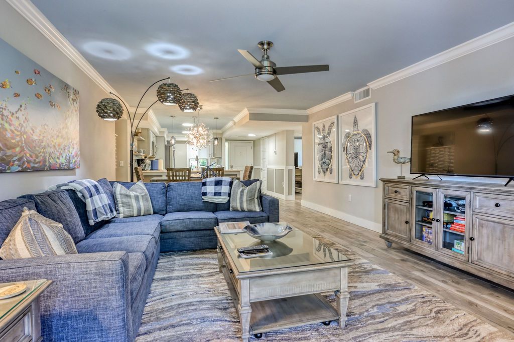 Light and spacious beach-side condo centrally located within a gated community. Walk to the beach via one of several private beach accesses or to the community’s pools, grills, courts, gym, and play areas within minutes. Located in a quiet and relaxed area away from the bustle of the island’s southern end makes this perfect for families and retirees alike. Golf courses, stores and entertainment are only a short drive from the property. No-contact check-in using your personal numeric code.