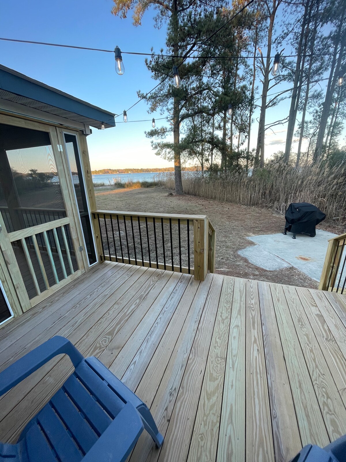 Cute & cozy (tiny) waterfront cottage nestled in a pine forest. Situated on an almost 3 acre point on the Diascund Reservoir this is THE perfect spot to get away from it all & still be in the middle of everything! Options abound - fishing from the dock, bird watching, canoeing, roasting marshmallows around the fire pit, swinging in the hammocks, napping on the screened in porch, grilling on the patio, reading in the loft, playing games (inside & out), or just chill & feel the vibe.