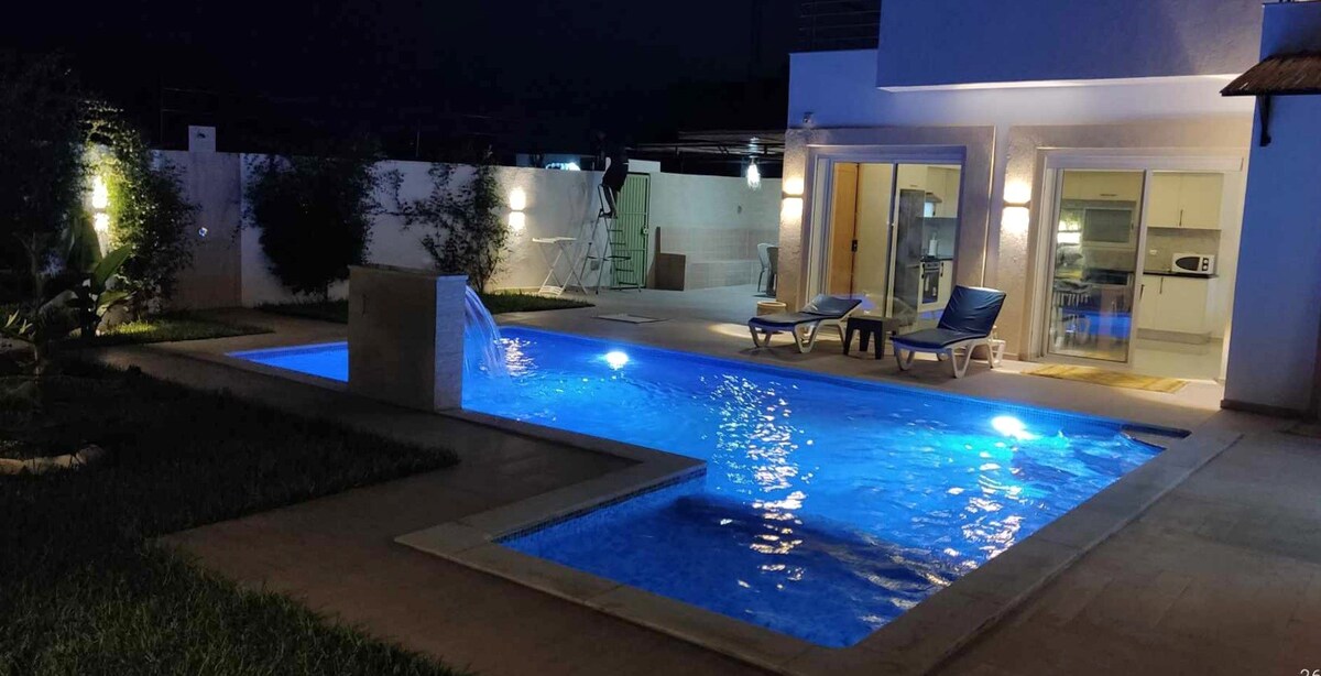 Καλώς ήρθατε στη βίλα μας χωρίς γείτονες, με πλήρη έκθεση στον ήλιο, σε μια ήσυχη περιοχή Διαθέτει μεγάλη ιδιωτική πισίνα, παιδική πισίνα, μεγάλο σαλόνι, εξοπλισμένη κουζίνα, γωνιά με πέργκολα για στιγμές χαλάρωσης, μπάρμπεκιου, άνετη γωνιά... Επιτρέπονται τα επιτραπέζια παιχνίδια για να διασκεδάσετε Απέχει 200 μέτρα από το τζαμί, και με το αυτοκίνητο: 2 λεπτά από το μίνι μάρκετ, 5 λεπτά από την παραλία και 15 λεπτά από το κέντρο της πόλης Midoun και το εμπορικό κέντρο Bourgo Mall Συνιστάται ανεπιφύλακτα η χρήση αυτοκινήτου