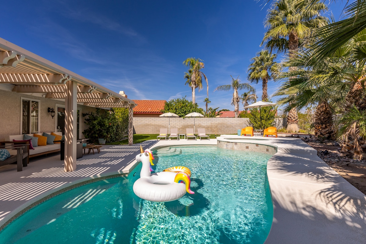 Ευρύχωρο σπίτι κατάλληλο για σκύλους με ιδιωτική θερμαινόμενη πισίνα, τραπέζι μπιλιάρδου, μπανιέρα τζακούζι, πολύ άνετα κρεβάτια, μεγάλη πίσω αυλή, σκεπαστή αυλή, μπάρμπεκιου αερίου, έξυπνη τηλεόραση 65 ιντσών, γιγάντιο οικογενειακό καναπέ, φορτιστή ηλεκτρικού αυτοκινήτου, WiFi 500 mbs. Κοντά σε γήπεδο γκολφ παγκόσμιας κλάσης, γήπεδο τένις, μουσικό φεστιβάλ Coachella, κέντρο του Παλμ Σπρινγκς, εναέριο τραμ, γραφική πεζοπορία, ζωολογικό κήπο Living Desert. Θέρμανση πισίνας: Δωρεάν από Μάιο έως Οκτώβριο και 50 $/ημέρα ή 1100 $/μήνα από Νοέμβριο έως Απρίλιο. Οι σκύλοι πρέπει να επιλέγονται κατά την κράτηση.