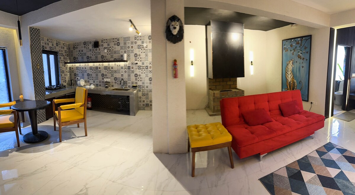 This is a 2bhk apartment which has two bedrooms attached with washrooms and one living room with sofa cum double bed attached to a washroom and a balcony. Lawn area is common for all the guests. Restaurant is open from morning 8 to evening 10 . Services like housekeeping , Room service , wifi , power backup, Parking is available. Property is not pet friendly.meals are not included in this price.