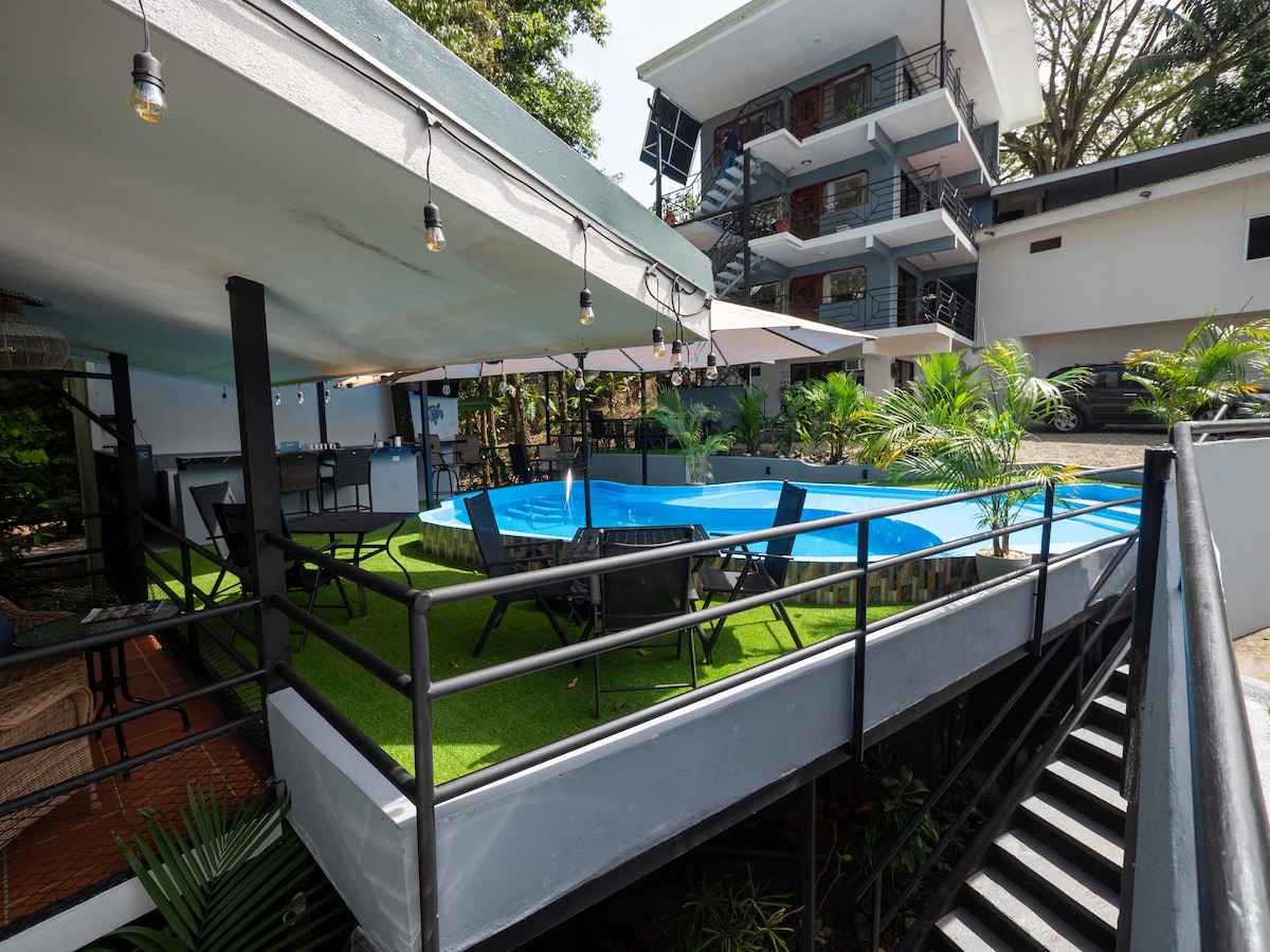 Βρισκόμαστε στην καρδιά του Μανουέλ Αντόνιο, έχουμε μια προνομιακή τοποθεσία με πρόσβαση στην παραλία και περιβάλλεται από πλούσια φύση. Οι εγκαταστάσεις προσφέρουν άφθονο χώρο στάθμευσης, ένα μπαρ tiki και καρέκλες παραλίας για τους επισκέπτες μας. Το δωμάτιο βρίσκεται στον πρώτο όροφο, είναι εύκολα προσβάσιμο και έχει έναν κοινωνικό χώρο ακριβώς μπροστά, ιδανικό για να το μοιράζεστε με την οικογένεια.