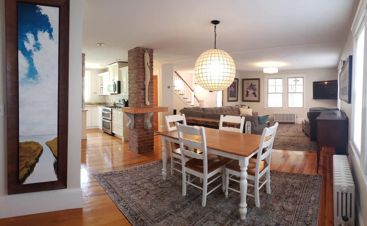 A true downtown gem. Sparkling clean PRIVATE 1,600 sq ft HOUSE. Unbeatable location with all that Plymouth has to offer literally outside the door - restaurants, the harbor and historic sites (yet on a quiet street). Stylish, renovated 5 bedroom, 2 full bathrooms, laundry, a huge front porch and hidden backyard courtyard. Full kitchen, dining room, and living room. Park 2-3 cars in driveway. Central AC. A guest favorite that rarely disappoints.