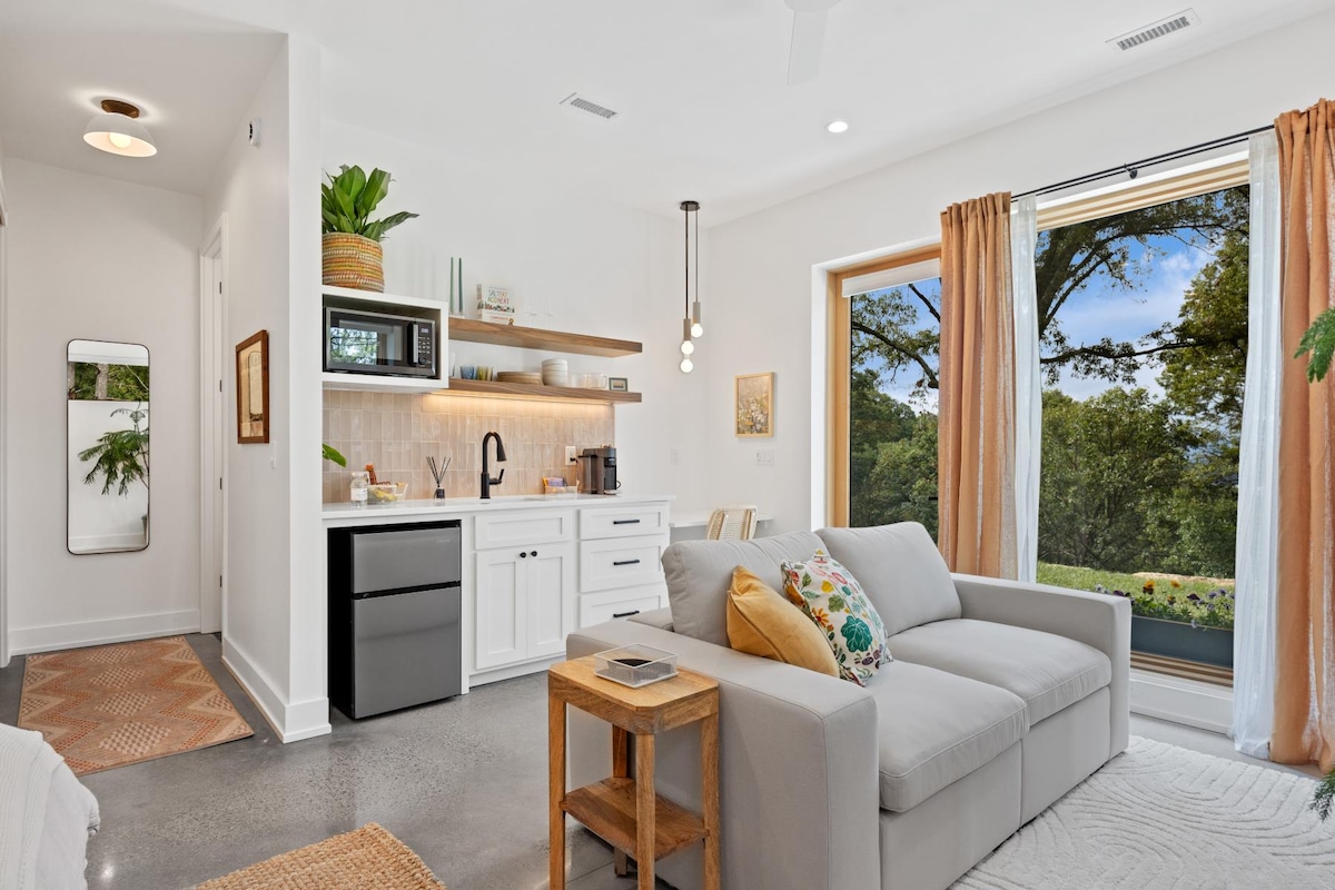 Μοντέρνο, πολυτελές, χαλαρωτικό και μεγάλο ιδιωτικό διαμέρισμα με ένα υπνοδωμάτιο (1.050 τετραγωνικά πόδια) με τζάκι, κρεβάτι KING & θέα στον αχυρώνα σε 2 όμορφα στρέμματα κάτω από πανύψηλα δέντρα, ενώ απέχει μόνο 8 λεπτά με το αυτοκίνητο (4 μίλια) από την καρδιά του κέντρου του Άσβιλ, Βόρεια Καρολίνα, 3 λεπτά (1 μίλι) από το Biltmore Estate, ζυθοποιεία και εστιατόρια, 5 λεπτά από το Blue Ridge Parkway, South Slope DT. Πηγαίνετε με ποδήλατο ή αυτοκίνητο σε ζυθοποιεία, καφετέριες και εστιατόρια. Ρομαντικό, ήσυχο, εξοχικό καταφύγιο, φωλιασμένο στη φύση. Ένα μοναδικό κόσμημα, κοντά σε όλα