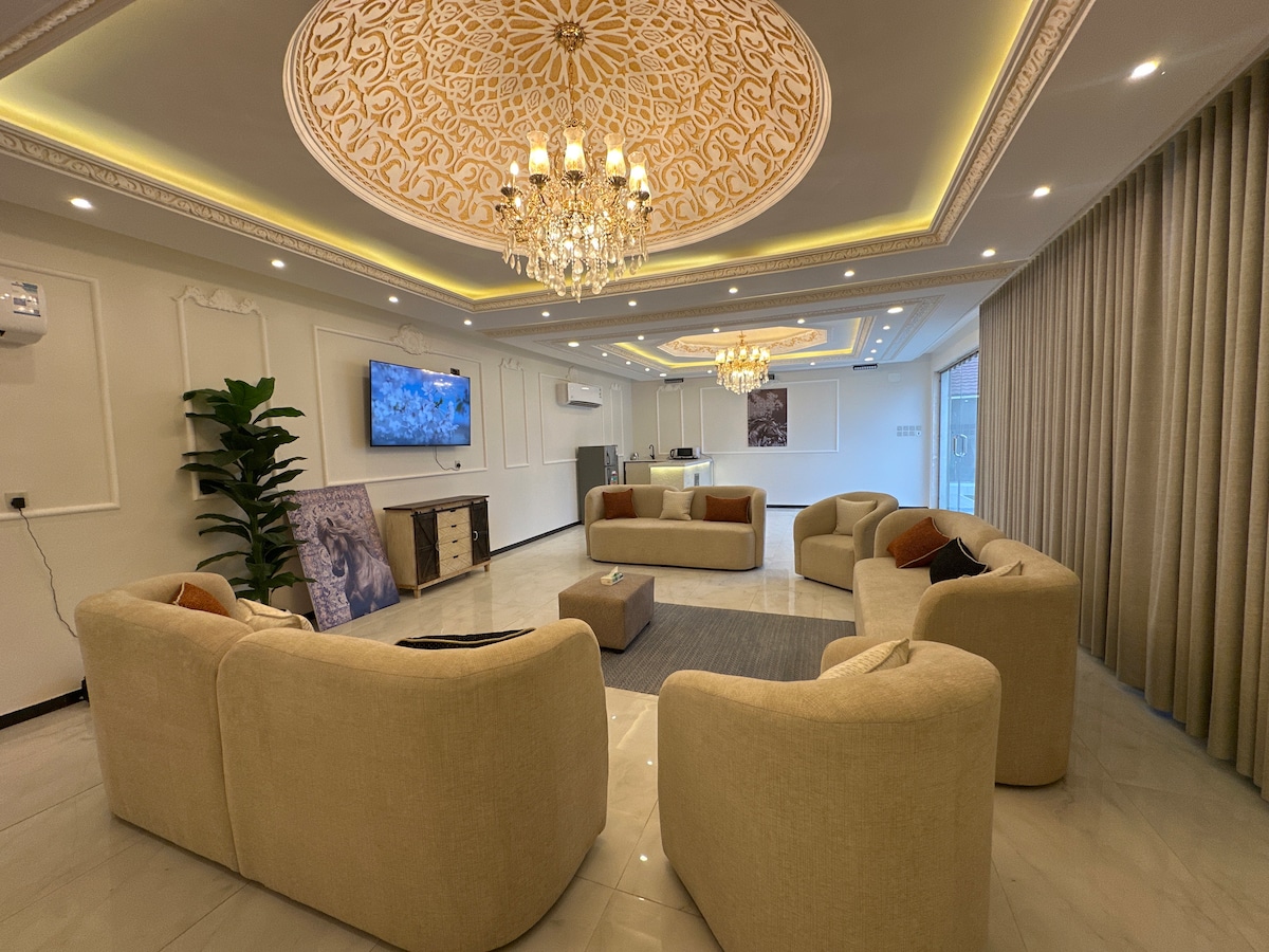 Welcome to The Mountain View, a luxury mountain-view villa located just 3 minutes’ walk from Hyde Park in Al-Namas. Set at the top of the Grand Mountain and close to main attractions, the villa offers spacious areas with separate men’s and women’s sections, which can be connected if needed. It features outdoor seating, a volleyball court, and a traditional Haneeth pit. Ideal for families and gatherings, providing comfort, privacy, and a unique stay.