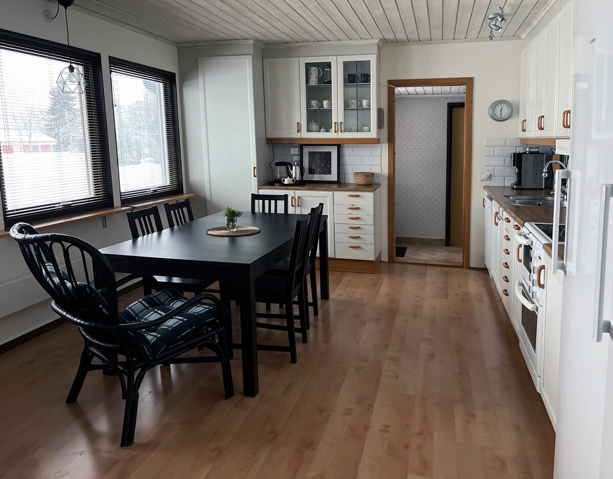 Guest house with small kitchen, stove and fridge, four beds all ready made, bathtowels and small towel for all guest. Outdoor Shower and outhouse, outdoor furniture and barbecue area near and down the lake. Wifi is available. There is a sauna down the lake and a boat included. Sometimes neighbors sharing the bathing place. Firewood is included for sauna and barbecue.