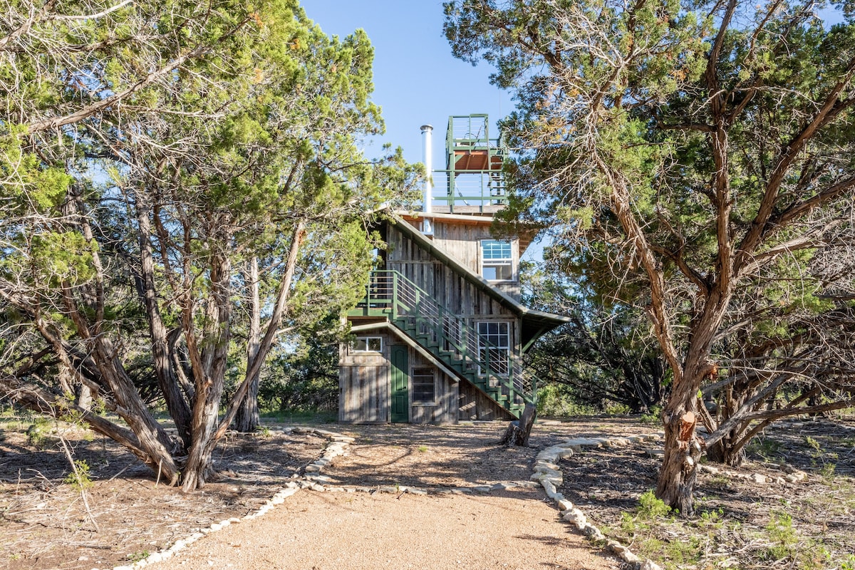 Εξερευνήστε μια απέραντη θέα του Texas Hill Country. Αυτό το χειροποίητο, μοναδικό δεντρόσπιτο βρίσκεται σε 37 δασικά στρέμματα. Με τη μοναδική σχεδίαση και το κομψό εσωτερικό του, το μονοπάτι πεζοπορίας μισού μιλίου, τις αιώρες και τη βεράντα με σήτα, το δεντρόσπιτο σάς προσκαλεί να χαλαρώσετε, να ξεκουραστείτε και να αναζωογονήσετε στη φύση. Δεν θα περιβάλλεστε από άλλα καταλύματα στην Airbnb εδώ. Κάντε κράτηση για μια-δυο νύχτες και απολαύστε λίγη ηρεμία. (Η σκεπαστή εξωτερική σκάλα σας μεταφέρει από την κουζίνα/μπάνιο του κάτω ορόφου στο υπνοδωμάτιο του 2ου ορόφου.)