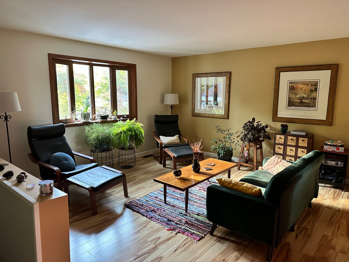 Πρόσφατα ανακαινισμένο κατάλυμα σε ήσυχη γειτονιά, σε κοντινή απόσταση με τα πόδια από το Kroger/εμπορικό κέντρο/καφετέρια/εστιατόριο-μπαρ, 5 λεπτά με το αυτοκίνητο/10 λεπτά με το ποδήλατο/30 λεπτά με τα πόδια από την πανεπιστημιούπολη IU Bloomington. Χώρος στάθμευσης στον ιδιωτικό δρόμο για δύο αυτοκίνητα. Καλυμμένες και εξωτερικές βεράντες, ηλιόλουστες. 1 υπνοδωμάτιο με διπλό κρεβάτι, 1 υπνοδωμάτιο με 2 μονά κρεβάτια (μήκος 180 εκατοστά), 1 υπνοδωμάτιο/γραφείο με ρυθμιζόμενο γραφείο και διπλό πτυσσόμενο κρεβάτι, 1 υπνοδωμάτιο με πολυθρόνα, 1 υπνοδωμάτιο/γραφείο με ρυθμιζόμενο γραφείο, χώρος για φουσκωτό κρεβάτι. 2,5 μπάνια. Γυμναστήριο στο υπόγειο με ελλειπτικό και στατικό ποδήλατο.