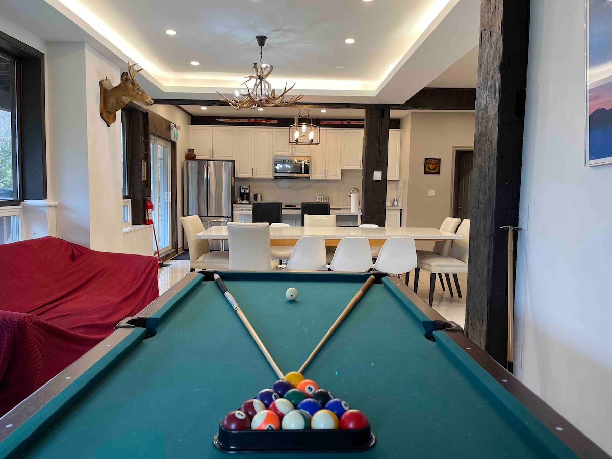 This Ski in/out chalet is only 13 min walk to the nearest Ski Lift. We have an outdoor Hot Tubs, an indoor Sauna, and Entertainment such as a Pool Table, video games and a large 75 inch HD TV for your movie nights. Surround your friends/families around our renovated Kitchen, large Centre Island and large Dining Room Table. Seat in our covered Sunroom to have a morning coffee or enjoy your BBQ food all year round. Worry free and leave your cars at our home: Only 7 min walk to the Village