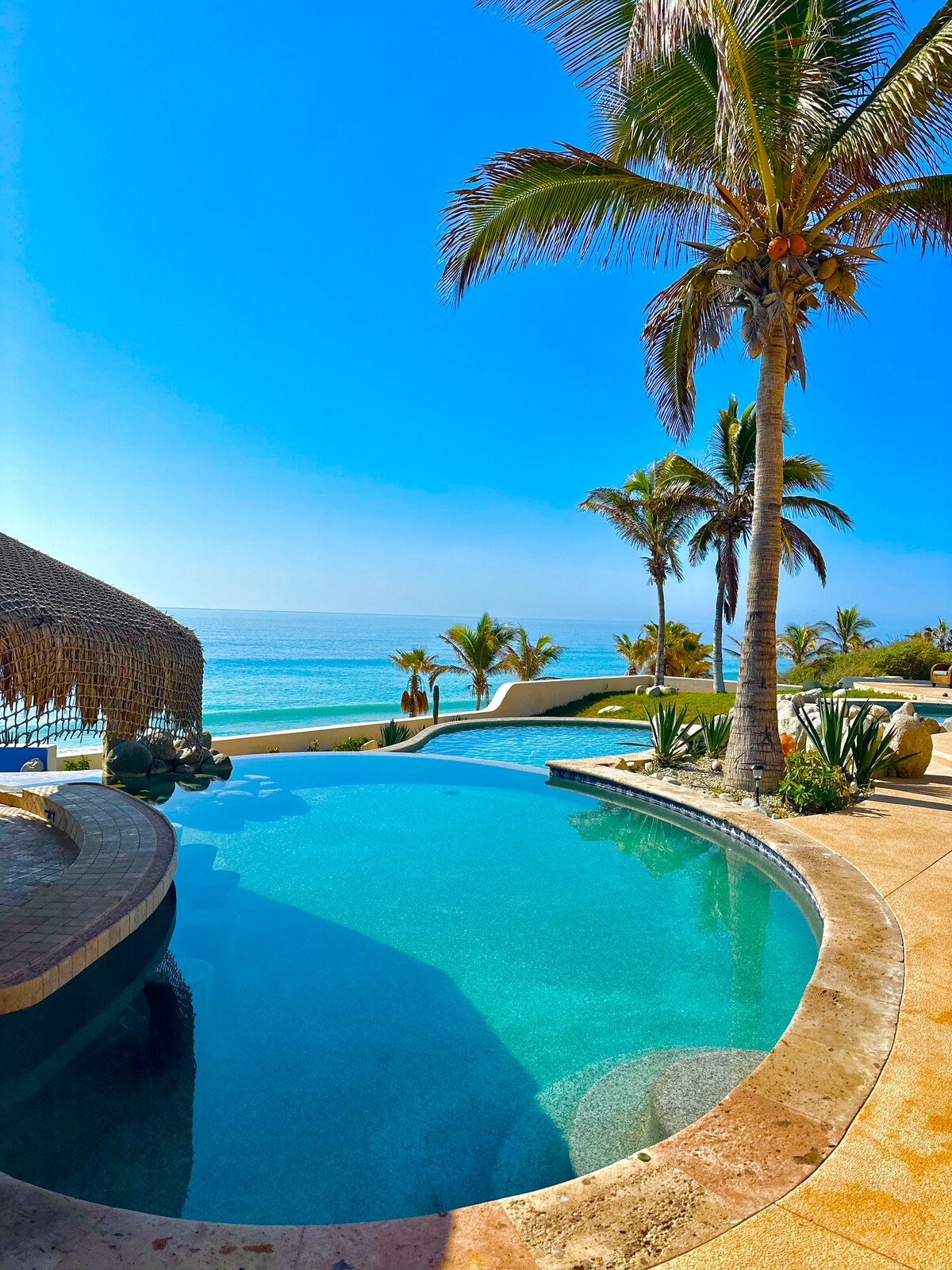 Oceanfront Oasis with Infinity Pool, a true paradise. One bedroom for two guests, with exclusive use of the entire house. Near Cabo Pulmo and world-class surf breaks. Off-the-grid, secluded beachfront home, straight from a Restoration Hardware catalog. Infinity pool and hot tub blend seamlessly with the ocean, only steps away. Miles of secluded beaches. Stunning sunrises from comfy swinging chairs. Watch whales jumping from the patio, so close you could almost touch them!
