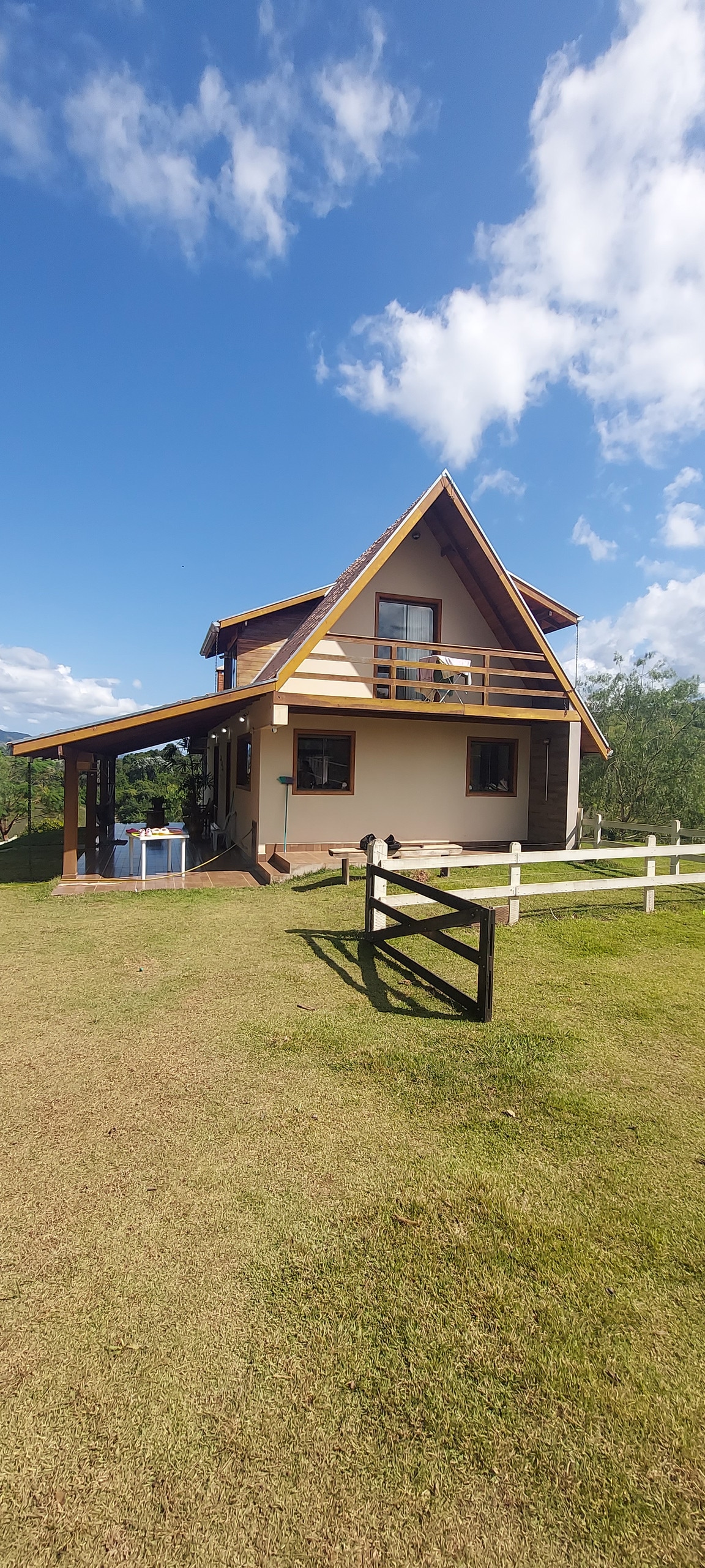 xale rústico com acomodação interna e externa confortavel. suíte com banheira no andar superior muito espaçosa com cama de casal e cama solteiro além de sacadas para o horizonte. ambiente social interno com sala cozinha americana com lareira e banheiro social e área de serviço com máquina de lavar. ambiente social externo com cozinha caipira e piscina. Wi-Fi para entretenimento e home ofice local sereno e tranquilo.