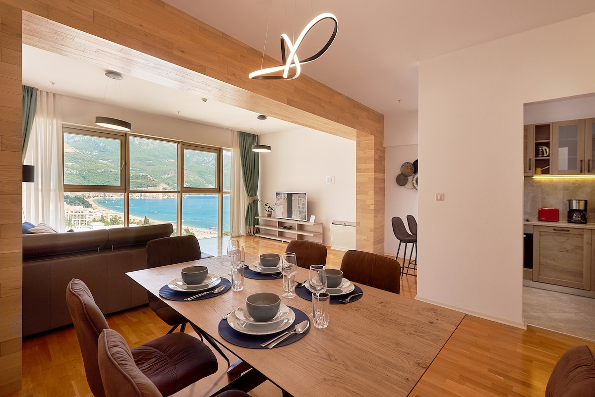 The new 4 room apartment with a modern interior design is located on the 6th floor and offers an unique panoramic view of the Adriatic Sea. This fully furnished contains 3 bed rooms, 2.5 bathrooms and offers great comfort and relaxation for up to 10 people! You as my guest have free access to the pools, lounge bars, saunas, Jacuzzi and gym. Enjoy a morning cup of coffee on the balcony with a fantastic view of Becici Bay and the pristine sea!