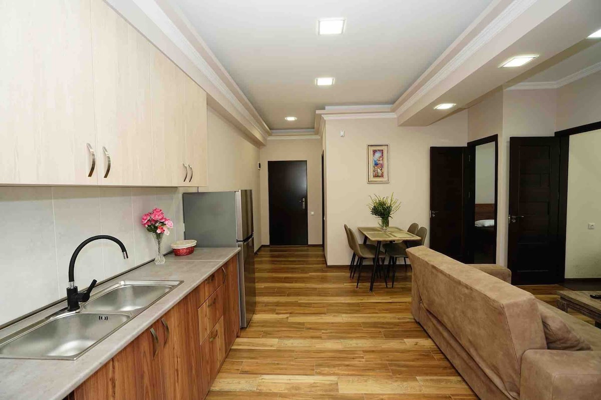 Πρόσφατα ανακαινισμένο πολυτελές διαμέρισμα στην καρδιά της πόλης Borjomi. Πολυτελές μπάνιο με Grohe Rainshower. Δύο υπνοδωμάτια με δύο άνετα κρεβάτια σε κάθε υπνοδωμάτιο. Πλήρως εξοπλισμένη κουζίνα με βραστήρα, φρυγανιέρα, τοστιέρα, εστία μαγειρέματος, εστία μαγειρέματος, ψυγείο, ψυγείο, καταψύκτη και πλυντήριο ρούχων. Καθιστικό με έναν καναπέ-κρεβάτι και ένα πτυσσόμενο κρεβάτι. Όμορφη θέα σε βουνά. Εξωτερικά: σκεπαστή βεράντα και καλοδιατηρημένοι κήποι. Πολύ κοντά από το Μουσείο, τα σούπερ μάρκετ, τους σιδηροδρομικούς σταθμούς και τους σταθμούς λεωφορείων και το διάσημο πάρκο Borjomi.