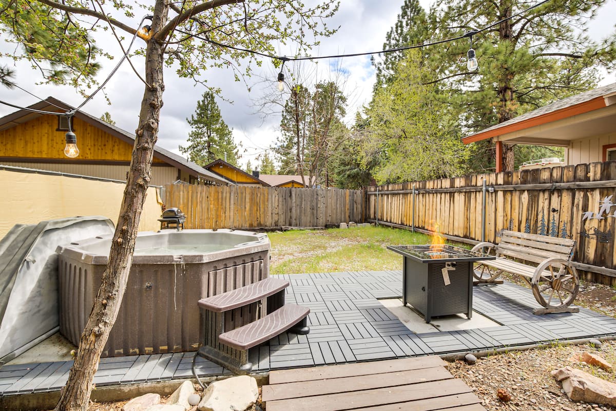 Casa Paloma is nestled in the mountains of Big Bear, just a short walk from the San Bernardino National Forest, Big Bear Mountain Resort, the Golf Course, and the Zoo! The cabin's main attraction is a large deck featuring a 10 person cedar wood hot tub, as well as a seating area and fire pit. This 70's inspired cabin features 4 bedrooms with a vintage flair. Watch the sun set over Big Bear Lake on the upper deck, or cozy up next to the fireplace after a long day of hiking or skiing.