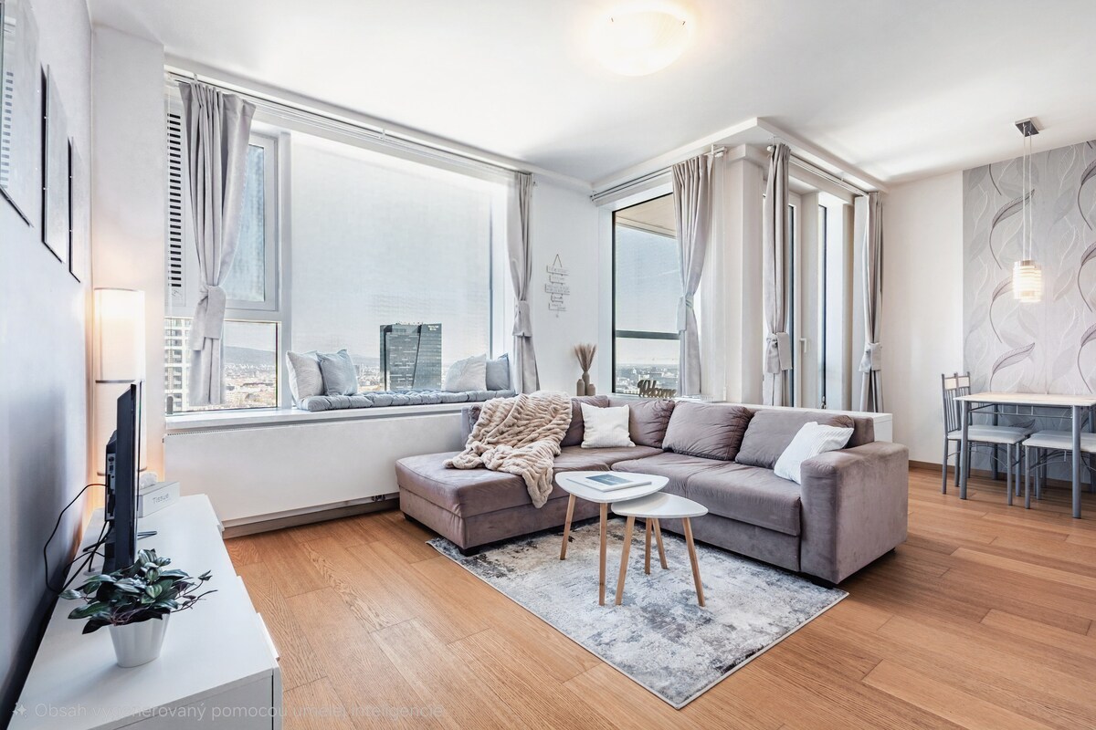 Έχετε βαρεθεί τα συνηθισμένα καταλύματα χωρίς την κατάλληλη εμπειρία; Ψάχνετε κάτι που θα σας κόψει την ανάσα και θα κάνει τη διαμονή σας αξέχαστη; Μπείτε στον κόσμο της πολυτέλειας στον 31ο όροφο με εκπληκτική θέα και αφεθείτε στο μεγαλείο της Μπρατισλάβα! Ξεκινήστε το πρωί με τον καφέ στο χέρι σας και θα παρακολουθήσετε την πόλη να ζωντανεύει από κάτω σας. Το βράδυ, μπορείτε να απολαύσετε ένα ποτήρι κρασί με πανοραμική θέα, το οποίο είναι πραγματικά μαγευτικό.