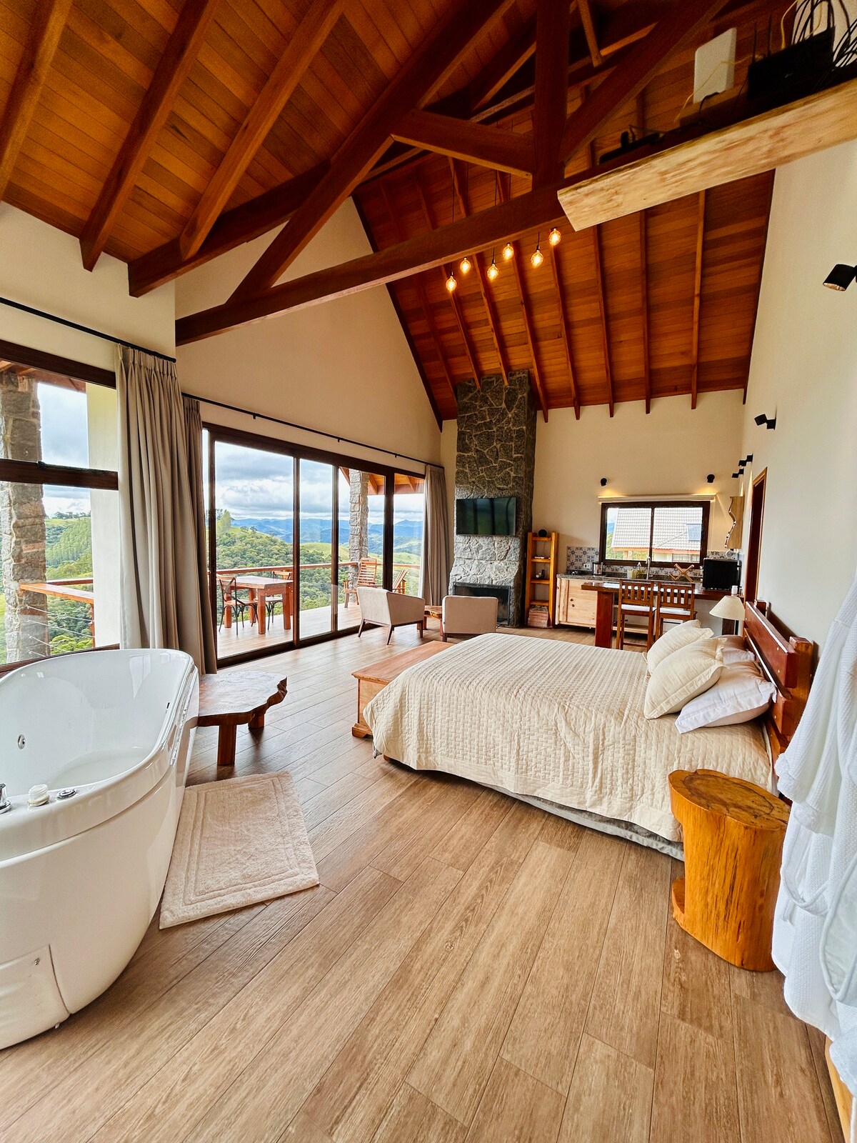 Το ξυλόσπιτο Recanto do Vale είναι ακριβώς αυτό που χρειάζεστε εσείς και η αγάπη σας, κάθε λεπτομέρεια σχεδιάστηκε έτσι ώστε να έχετε απίστευτες μέρες και αξέχαστες στιγμές. Επειδή είναι όλο περίκλειστο σε γυαλί, μπορεί να είναι κρύες μέρες με βροχή και άνεμο που θα απολαύσετε το θερμπόνι με θέρμανση απολαμβάνοντας τη θέα στα βουνά με απόλυτη άνεση σε ένα μέρος απόλυτης ηρεμίας. και μπορείτε επίσης να απολαύσετε τον κοινόχρηστο χώρο, όπου έχουμε μια λίμνη με ψάρια και ένα ράντσο για να απολαύσετε τη θέα.