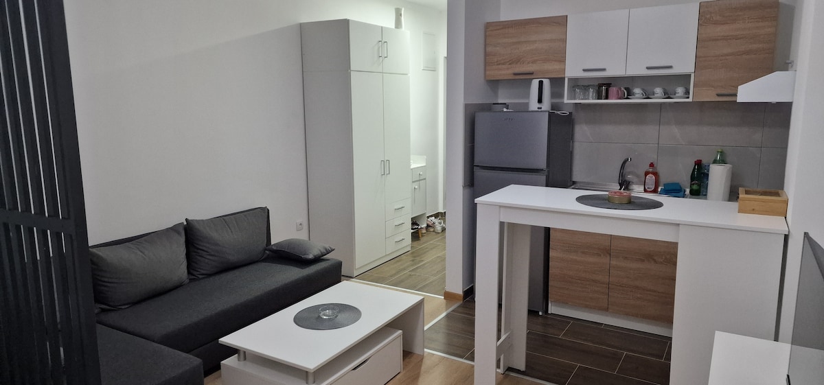 Nov apartman, potpuno opremljen, nalazi se na mirnoj lokaciji udaljen od centra oko 2.8km. U radijusu od 300m nalaze se restorani, trgovine, Evropski Univerzitet...