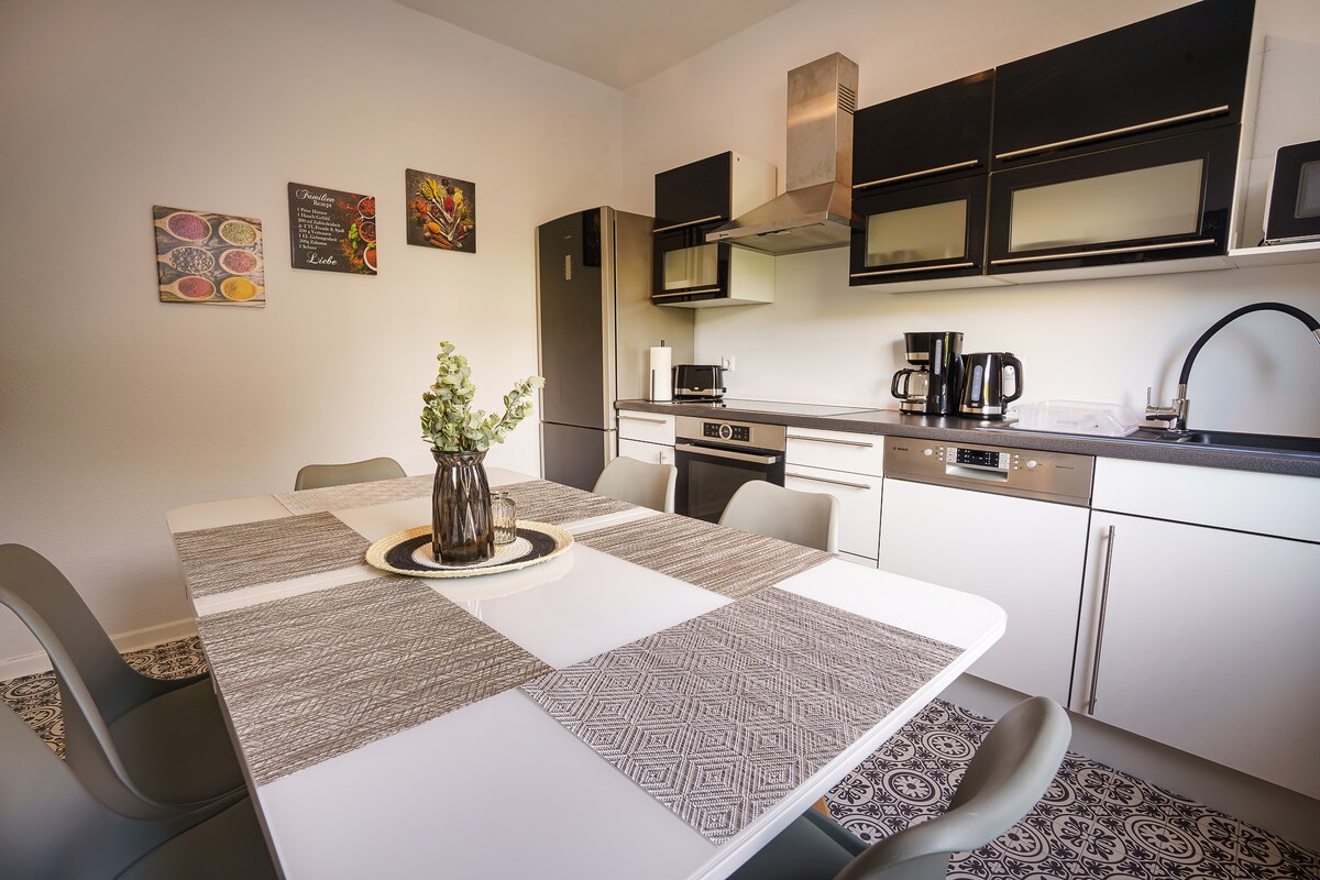 Welcome to our modern and stylish 2-room flat with 5 beds, own kitchen and good parking facilities . Enjoy your morning coffee on one of the two balconies, accessible from every room. The location is perfect: quiet yet central in Stuhr, with quick access to Bremen city centre and the airport. Shopping facilities, restaurants and IKEA are nearby. Explore the ramparts along the Weser. The neighbourhood is wonderfully quiet.