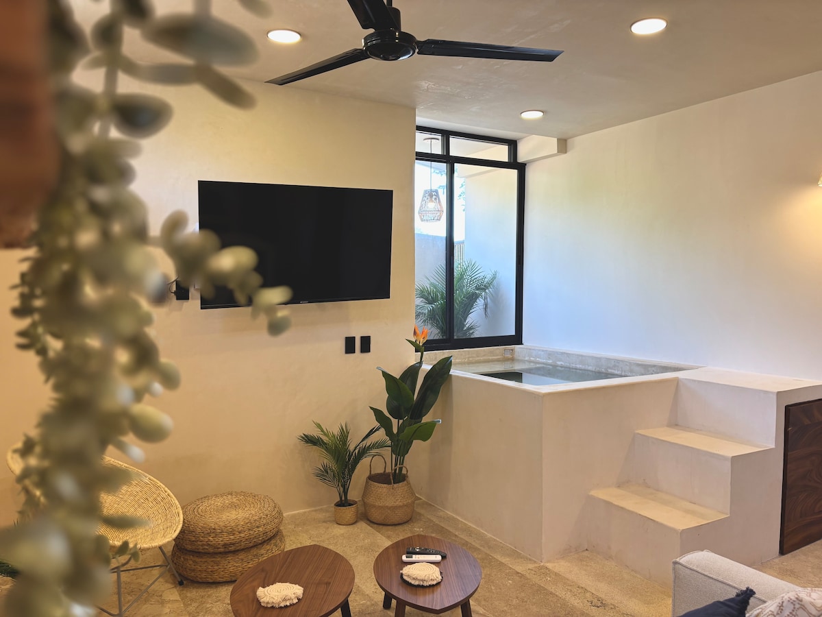 Depa amplio y luminoso en planta alta con 2 camas queen súper cómodas, A/C en la recámara y ventiladores en sala y cocina. Cuenta con cocina equipada, salita acogedora y balcón con vista a palmeras. Estás a solo 2 min de la playa y a 1 min de cafés, tiendas y restaurantes. Disfruta el patio compartido con hamacas, árboles frutales, asador y área de pesas artesanales. Ideal para relajarte, surfear o trabajar remoto con buena vibra.